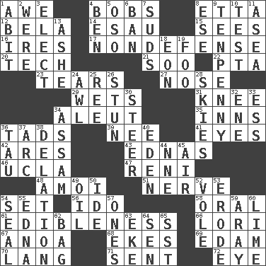 ACROSS 1. Deep reverence 4. Moves up and down 8. Singer James 12. Actor Lugosi 14. Son of Isaac 15. Perceives with the eye 16. Angers 17. Unrelated to defense, as in spending 20. Technology 21. "Barney Miller" actor Jack 22. Parent Teacher Assoc. 23. Pulls into pieces 27. Characteristic smell of wine 29. Moistens 31. Leg joint 34. Eskimo relative 35. Restaurants 36. Bits 39. Born 41. Sight organs 42. Ancient Greek god of war 43. Ferber et al. 46. Southern CA. univ. 47. Painter Guido (1575-1642) 48. Mine, in Marseilles 51. Boldness 54. Put into a specified state 56. Wedding promise 58. Relating to the mouth 61. The property of being fit to eat 66. Australian parrot (variant) 67. Small Philippine buffalo 68. Supplements with great effort 69. Dutch treat 70. Austrian-born American filmmaker Fritz 71. Transmitted 72. Sight organ DOWN 1. "This won't hurt ____!" 2. We are 3. Voters do this 4. Benjamin's nick name 5. Bear (Spanish) 6. Bar 7. Beer foam 8. Compass dir. 9. 3-inch nail 10. Trial 11. Toward the sea 13. American tennis player Robert 18. A really long time 19. Egg _ yung 24. Leather borer 25. Portuguese money of account (variant) 26. Make senseless or dizzy 28. Atmospheres 30. Navigate 32. Compass dir. 33. Curvy letter 34. Indian state 36. The 19th letter of the Greek alphabet 37. Curve 38. Conveyance 40. Paradise 44. Compass dir. 45. Wind 49. Lubricate 50. Binary compound 52. Grand slam 53. Eat (away) 54. Lick closed 55. Pulitzer Prize-winning author Ferber 57. Singles 59. Like ___ of sunshine 60. Citrus frut 62. Paper or plastic container 63. Make supply last 64. Elected rep. 65. Fast jet (abbr.)