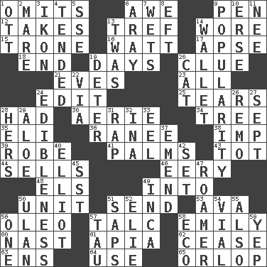 ACROSS 1. Leaves out 6. Deep reverence 9. Fenced enclosure 12. Receives possession of 13. Unclean, religiously 14. Had on 15. Marketplace scale 16. Electrical Unit 17. Domed church section 18. Conclude 19. 24-hour periods 20. A slight indication 21. Nights before holidays 23. Everything 24. Prepare for publication 25. Separates forcefully 28. Possessed 30. Nest on high 34. Relationship diagram 35. Connecticut Ivy Leaguer 36. Indian princess (variant) 38. Mischievous child 39. Loose flowing garment 41. Insides of hands 43. Small child 44. Exchanges for money 46. Suggestive of the supernatural 48. Raised railways 49. To the inside or interior of 50. A single undivided whole 51. Post 53. Actress Gardner 56. Butter sub 57. Baby powder 58. Poet Dickinson 60. Political cartoonist Thomas 61. Capital of Western Samoa 62. Desist 63. Followers of ems 64. Purpose 65. Fourth or lowest deck DOWN 1. Baseball player Mel 2. Female horse 3. Picture 4. Watched over 5. Compass dir. 6. Like ___ of sunshine 7. Moistens 8. Lizard (obsolete) 9. Teen's desire 10. Celtic language 11. Born 13. It was, poetically 14. Place for singles 19. Prevent from occurring 20. Domesticated feline 22. By way of 24. The property of being fit to eat 26. San ____ (Riviera town) 27. Back-to-school mo. 28. Possessive pronoun 29. Medicinal plant 31. Strike 32. _ tizzy (2 wds.) 33. Snakelike fish 37. Make improvements or corrections to 40. American author Paul (1891-1958) 42. Arrange properly for use 45. Fast jet (abbr.) 47. Wanderer 49. South American Indian 50. ____ Bator, Mongolia 51. Plant excrements 52. Writer Wiesel 54. Small bottle 55. In addition 56. Single 57. The 19th letter of the Greek alphabet 58. Environmental prefix 59. Slangy assent
