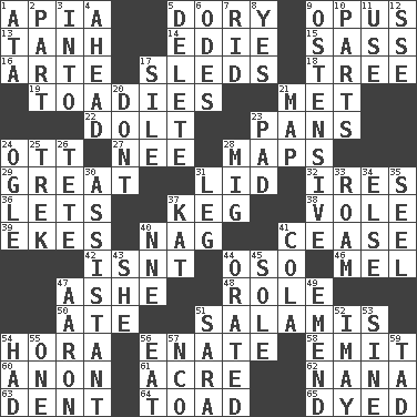 ACROSS 1. Capital of Western Samoa 5. Small, narrow, flatbottom fishing boat 9. Musical composition 13. Hyperbolic tangent 14. Singer Brickell 15. Backtalk 16. Johnson of "Laugh-In" 17. Bobsleighs 18. Family _ (genealogy) 19. Sycophants 21. Was introduced to 22. Dunce 23. Zero-star reviews 24. Baseball player Mel 27. Born 28. Atlas contents 29. Relatively large 31. Flaplike covering 32. Angers 36. Allows 37. Barrel 38. Short-tailed, large-bodied rat 39. Supplements with great effort 40. Tired old horse 41. Desist 42. Is not 44. Bear (Spanish) 46. Cartoonist voice _ Blanc 47. American tennis player Robert 48. Hero or heavy, e.g. 50. Had dinner 51. Deli grouping 54. Israeli folk dance 56. Related on the mother's side 58. Send forth 60. Soon (poet.) 61. 43,560 square feet 62. Grandmother 63. Undesirable depression on a surface 64. Frog relative 65. Colored DOWN 1. "One Day ___ Time" 2. Role in a play 3. To the inside or interior of 4. At or in the front 5. Erase 6. Lyric poems 7. To free from 8. It is so 9. Clearly or manifestly demonstrative 10. Components 11. Purpose 12. Compass dir. 17. Drop; flow; fall 20. Do not 21. Atlas unit 23. Groovy apt. 24. Stare at amorously 25. Long journey 26. False hair 28. Russian fighter aircraft 30. Aide 31. Part of a journey 33. Wander aimlessly 34. Otherwise 35. Sew up the eyelids of hawks and falcons 37. Krazy ___ of comics 40. Compass dir. 41. Root beer relative 43. A female animal or person 44. Declaimed 45. Not divided or shared with others 47. Composer Copland 49. Make improvements or corrections to 51. "Two Mules for Sister ____" 52. "If ____ say so..." 53. Trig term 54. Possessed 55. Single 56. Erode 57. Non-commissioned officer (abbr.) 59. Small amount or degree