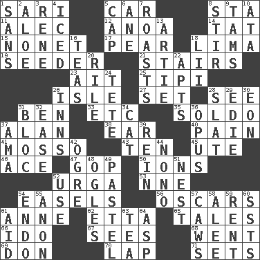 ACROSS 1. Indian skirt 5. Automobile 8. R.R. building 11. Actor Baldwin 12. Small Philippine buffalo 14. Make lace 15. Music written for nine 17. Lightbulb-shaped fruit 18. Pale green bean 19. Sowing specialist 21. Flight of steps 23. Small island 25. Native american tent (variation) 26. Capri or Wight 27. Put into a specified state 28. Perceive with the eye 31. Benjamin's nick name 33. And so on (abbr.) 35. Twentieth part of a lira 37. Actor Alda or Thicke 38. Hearing organ 40. Ache 41. With motion or animation 43. Nine, plus one 45. Shoshoni 46. Adept person 47. Grand Old Party 50. Charged particles 52. Capital and largest city of Mongolia 53. Compass dir. 54. Artist's stands 56. Motion picture awards 61. Singer Murray 62. Singer James 65. Stories 66. Wedding promise 67. Observes 68. Left 69. Spanish title 70. Pet locale 71. Arranges properly for use DOWN 1. Without 2. Medicinal plant 3. French philosopher Descartes 4. On the rocks 5. Head covering 6. A saturated hydrocarbon 7. Ridicules or criticizes harshly 8. Tumult 9. Scottish caps 10. "One Day ___ Time" 13. Nick name for Arthur 16. Afternoon social gatherings 18. Cards in a Roman deck? 20. Cause heat under the collar 22. Tenement units (abbr.) 24. False hair 26. Restaurants 28. Narrow board 29. Singer Brickell 30. Period of immesurable duration 31. Group of countries in special alliance 32. Comfort 34. Domesticated feline 36. Musical composition 37. Housemaid (var.) 39. It's straight from the horse's mouth 42. Legendary monster 44. Words to Nanette 48. Stares at amorously 49. Soft color 51. A home for chicks 52. Purpose 54. Inside; within (prefix) 55. Soon (poet.) 57. Crow sounds 58. Toward shelter 59. Monthly bill 60. Fast planes 61. Assist 63. Afternoon social gathering 64. Cleo's killer