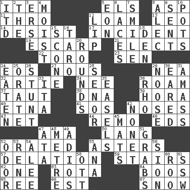 ACROSS 1. Detail 5. Raised railways 8. Cleo's killer 11. Through, poetically 12. Rich soil 13. Lion 14. Stop 17. Event 19. Fortification 21. Chooses 22. "Corrida" creature 23. Elected rep. 24. Greek goddess of the dawn 27. Horse sense 29. Teachers' org. 32. Nick name for Arthur 34. Born 36. Wander 37. Strained 38. Heredity factor (abbr.) 39. Israeli folk dance 40. Inactive volcano in Sicily 41. Distress signal 42. Olfactory organs 43. Fish or hair follower 44. San ____ (Riviera town) 46. Begley and Asner 47. Nanny (var.) 50. Long (Scottish) 52. Spoke pompously 55. Michaelmas daisies 57. Accusation by an informer 59. Flight of steps 62. Single 63. Roll call or roster of names 64. Expressions of contempt or scorn 65. To sift 66. Eastern Standard Time (abbr.) 67. Overwhelm DOWN 1. It would 2. Definite Article 3. Celtic language 4. Wet 5. Period of immesurable duration 6. Shoestrings 7. Grin 8. Actor Baldwin 9. Emitted 10. Plant holders 12. Mouth edge 15. Biscuitlike quick bread 16. Pacific island yam 18. Lair 20. Periods in a boxing match 24. Eroded 25. Speak pompously 26. Difficult or unusual or dangerous feat 28. Sir (Sp.) 29. Trap for birds or small mammals 30. Having ears or earlike features 31. Collect or gather 33. Call ___ day 35. Artist's stands 36. 17th letter of the Greek alphabet 42. Music written for nine 45. Floor protectors 47. "One Day ___ Time" 48. Distance measurement (Brit.) 49. Goodbye (Sp.) 51. Catches 52. Aroma 53. French philosopher Descartes 54. Toward shelter 55. Santa ___, CA 56. The Jewish people; Israel 58. Baseball player Mel 60. Friend of Pooh 61. Compass dir.