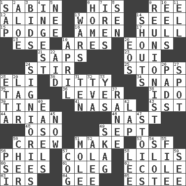 ACROSS 1. Unit of acoustic absorption 6. Part of HMS, perhaps 9. To sift 12. Place in a line 13. Had on 14. Stitch closed the eyes of (a falcon) 15. Porridge 16. So be it 17. Frame or body of a ship 18. Compass dir. 19. Ancient Greek god of war 20. Immeasurably long periods of time 21. Plant excrements 23. Fr. "Yes" 24. Agitate 25. Closes up, plugs up 28. Connecticut Ivy Leaguer 30. Short, simple song 34. Fastener 35. Label 36. Crowbar 38. Wedding promise 39. Prong on a fork 41. Rhinal 43. Fast jet (abbr.) 44. Believer in; advocate of (suffix) 46. Political cartoonist Thomas 48. Bear (Spanish) 49. Back-to-school mo. 50. Ship's personnel 51. Cause to be 53. Order of Saint Francis (abbr.) 56. Silvers or Donahue 57. Root beer relative 58. Ms. Damita and namesakes 60. Perceives with the eye 61. Cassini of fashion 62. Learning spot: Fr. 63. Big collection agency 64. Unit of force equal to gravity 65. First name in cosmetics DOWN 1. Plant excrement 2. Medicinal plant 3. Auction offers 4. Consume 5. Born 6. Dwelling 7. Angers 8. Elected rep. 9. One who advocates reunion 10. Snakelike fish 11. Pipe bend 13. Armed conflicts 14. Yells 19. Showery time 20. Greek goddess of the dawn 22. Assist 24. Seigniories (variant) 26. Groovy apts. 27. Blemish 28. Singer James 29. Den 31. Nine, plus one 32. Federal power corp. 33. It is so 37. Indian princess (variant) 40. Artist's stands 42. Pet locale 45. Immediately 47. Unemotional ones 49. Heroin 50. "Mermaids" star 51. Undercover agent 52. Toward shelter 54. Notch 55. Do some clerical work 56. 23rd letter of the Greek alphabet 57. Gear tooth 58. Area sheltered from the wind 59. Observe