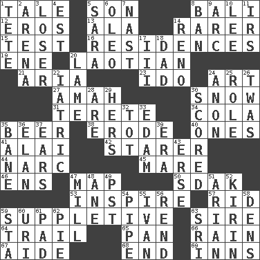 ACROSS 1. Falsehood 5. Male child 8. Indonesian resort city 12. Greek god of love 13. Insect wing 14. More valued for its uncommonness 15. Trial 16. Homes 19. Compass dir. 20. Of or relating to Laos or its people 21. Roberta Peters solo 23. Wedding promise 24. Tate display 27. Nanny 30. Frozen precipitation 31. Cylindrical with tapered ends 34. Root beer relative 35. Fermented drink made from hops 38. Eat (away) 40. Singles 41. Jai _ 42. A viewer who gazes fixedly 44. Drug cop 45. Female horse 46. Followers of ems 47. Atlas unit 50. Neighbor of Neb. 53. Stimulate to action 57. To free from 59. Supplying deficiencies 63. Father 64. Drop behind 65. Baking dish 66. Precipitation 67. Assistant 68. Conclude 69. Lodging establishments DOWN 1. Wig 2. Sports stadium 3. Failure 4. Eastern Standard Time (abbr.) 5. "Two Mules for Sister ____" 6. Margarine 7. Political cartoonist Thomas 8. Forbid 9. Curve 10. Area sheltered from the wind 11. Big collection agency 14. Former U.S. Attorney General Janet 17. One more than two 18. June honoree 20. Unable to walk 22. Of or pertaining to medicine 24. Soon (poet.) 25. Hero or heavy, e.g. 26. It was, poetically 28. "We ___ not amused" (Victoria) 29. Possessive pronoun 30. Tallied 32. Small child 33. Dutch treat 35. Object of repulsion 36. Liveliness 37. Hearing organs 39. Epoch 43. Celtic language 47. Place where flour is made 48. A saturated hydrocarbon 49. Pacific Standard Time (abbr.) 51. Believer in; advocate of (suffix) 52. Japanese brewing company 54. Corncob 55. "Terrible" tsar 56. Tear apart 58. Cub Scout units 59. R.R. building 60. RI univ. 61. Writing tablet 62. Sliced dessert 63. _ Lanka