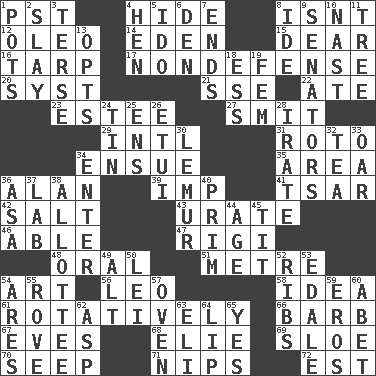 ACROSS 1. Pacific Standard Time (abbr.) 4. Flintstone garb 8. Is not 12. Margarine 14. Paradise 15. Letter starter 16. Canvas cover 17. Unrelated to defense, as in spending 20. System (abbr.) 21. Compass dir. 22. Had dinner 23. First name in cosmetics 27. Stricken, poetically 29. International (abbr.) 31. Printing process, for short 34. Take place subsequently 35. Length times width 36. Actor Alda or Thicke 39. Naughty child 41. Russian ruler of old 42. Table seasoning 43. A salt of uric acid 46. Competent 47. Swiss mountan, "Queen of the Mountains" 48. Relating to the mouth 51. Distance measurement (Brit.) 54. Tate display 56. Lion 58. The main thing one is thinking about 61. Happening in regular succession 66. Sharp remark 67. Nights before holidays 68. Writer Wiesel 69. A type of plum 70. Ooze 71. Pinches, bites 72. Eastern Standard Time (abbr.) DOWN 1. Cooking vessels 2. Kill 3. Laconic 4. Layer 5. Wedding promise 6. Lair 7. Extremities 8. Binary compound 9. Elected representatives 10. Political cartoonist Thomas 11. Family _ (genealogy) 13. Chooses 18. Double-curved letter 19. Opposite of masc. 24. Shallow baking pan 25. Followers of ems 26. Needle holder 28. Feeling or showing extreme anger 30. Arboreal primate 32. Beverage made from leaves 33. Boat paddle 34. Keyboard key 36. White ___ sheet 37. Experiment locale 38. One to whom something is allotted 40. Demure 44. Grow older 45. Teat (slang) 49. The first octave above the treble staff 50. Flowery wreath 52. Teases 53. Peak District village in England 54. Ancient Greek god of war 55. Be footloose 57. Baking chamber 59. Greek god of love 60. Collude with 62. Cleo's killer 63. Connecticut Ivy Leaguer 64. Mouth edge 65. Affirmative reply