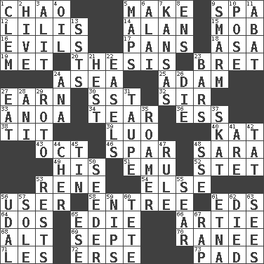 ACROSS 1. US Secretary of Labor Elaine L. _ 5. Cause to be 9. Health resort 12. Ms. Damita and namesakes 14. Actor Alda or Thicke 15. Disorderly crowd 16. Vices 17. Baking dishes 18. White ___ sheet 19. Was introduced to 20. College paper 23. Cy Young winner Saberhagen 24. Toward the sea 25. First of billions? 27. Merit 30. Fast jet (abbr.) 32. Title for a knight 33. Small Philippine buffalo 34. Pull into pieces 36. Double-curved letter 38. Teat (slang) 39. Nilotic language 40. Krazy ___ of comics 43. Sep. follower 46. Practice fight 48. "Two Mules for Sister ____" 49. Part of HMS, perhaps 51. Australian flightless bird 52. Proofreading order 53. French philosopher Descartes 54. Otherwise 56. One who uses or employs something 58. Main course 61. Begley and Asner 64. Two (Sp.) 65. Singer Brickell 66. Nick name for Arthur 68. The first octave above the treble staff 69. Back-to-school mo. 70. Indian princess (variant) 71. French article 72. Celtic language 73. Groovy apts. DOWN 1. Clement's nick name 2. Hub of activity 3. Set down 4. Lubricate 5. Atlas contents 6. Mountain range southwest of Kyrgyzstan 7. Sunflower state 8. Followers of ems 9. Excessive but superficial compliments 10. Airs 11. Blind as ____ 13. Fast planes 21. Behest 22. Artist's stands 23. Oblong pieces of solid material 24. Santa ___, CA 26. Pass on 27. Consume 28. Black tropical American cuckoo 29. Printing process, for short 31. Grayish beige 35. Nomad 37. Three-handed card game 41. "We ___ not amused" (Victoria) 42. Make lace 44. "Mermaids" star 45. Metal container 47. Governing power 48. Compass dir. 50. Sowing specialist 53. Musical pauses 55. Burn superficially 56. Allodial 57. Not divided or shared with others 59. Cuts off 60. Wig 61. Inactive volcano in Sicily 62. Passed on 63. Perceives with the eye 65. Compass dir. 67. Strike