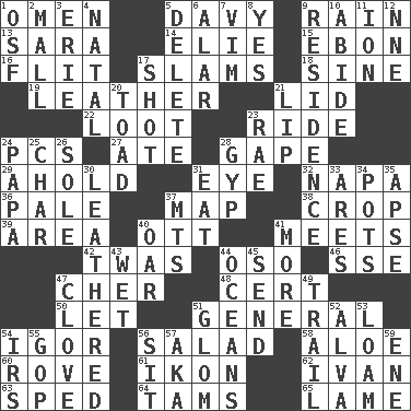 ACROSS 1. Sign of something about to happen 5. American folk hero Crockett 9. Precipitation 13. "Two Mules for Sister ____" 14. Writer Wiesel 15. Inky black, to poets 16. Sudden quick movement 17. Shuts with force 18. Trig term 19. Cordwainer's material 21. Flaplike covering 22. Spoils 23. Travel on an animal 24. Personal Computers (abbr.) 27. Had dinner 28. Yawn 29. Hold, grip (Informal) 31. Sight organ 32. California wine valley 36. Diluted with white 37. Atlas unit 38. Riding implement 39. Length times width 40. Baseball player Mel 41. Confronts 42. It was, poetically 44. Bear (Spanish) 46. Compass dir. 47. "Mermaids" star 48. Sure thing 50. Allow 51. Commissioned military rank 54. Composer Stravinsky 56. Vegetable dish 58. Medicinal plant 60. Be footloose 61. Visual representation of an object 62. _ the terrible 63. Hurried 64. Scottish caps 65. Unable to walk DOWN 1. Order of Saint Francis (abbr.) 2. Shopping center 3. 4th largest of the Great Lakes 4. Brizilian seaport 5. Erase 6. Having or resembling wings 7. Zeal 8. Consenting reply 9. Dwelling 10. Remain 11. Electrically charged atom 12. Compass dir. 17. Guess 20. Frog relative 21. Mouth edge 23. Actress Charlotte 24. Dad 25. Burn to charcoal 26. Not divided or shared with others 28. Flimflam 30. Tough but pliablecoriaceous 31. Ingest 33. Ancient Greek god of war 34. Cooking vessels 35. Domed church section 37. Mountains (abbr.) 40. Boat paddle 41. Greater amount 43. Dripping 44. Seas 45. Post 47. Garlic unit 49. Go after with the intent to catch 51. Take by theft 52. Inventor's middle name 53. Rich soil 54. Big collection agency 55. Grand Old Party 56. Be seated 57. Alias (abbr.) 59. Compass dir.