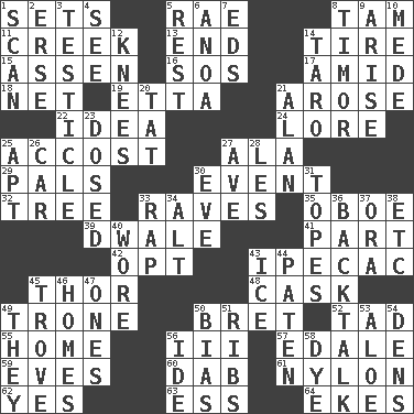 ACROSS 1. Arranges properly for use 5. Actress Charlotte 8. Scottish cap 11. Small stream 13. Conclude 14. Become fatigued 15. NE Netherlands city 16. Mayday 17. Among 18. Fish or hair follower 19. Singer James 21. Came up 22. The main thing one is thinking about 24. Old wives' tales, e.g. 25. Buttonhole 27. Wing 29. Friends 30. Incident 32. Family _ (genealogy) 33. All-night dance parties 35. Mitch Miller's instrument 39. A sleeping potion; an opiate (poet.) 41. Component 42. Elect 43. Medicinal drug used to evoke vomiting 45. Son of Odin 48. Keg 49. Marketplace scale 50. Cy Young winner Saberhagen 52. Small amount or degree 55. Dwelling 56. One more than two 57. Peak District village in England 59. Nights before holidays 60. Apply (a substance) by light strokes 61. High-strength synthetic material 62. It is so 63. Double-curved letter 64. Supplements with great effort DOWN 1. Examine hastily 2. Celtic language 3. One of the two male reproductive glands 4. Observe 5. State of inaction 6. Small Philippine buffalo 7. Begley and Asner 8. The easternmost of the Lesser Sundas 9. Originate 10. Ancient Persian 12. Leg joints 14. Pacific island yam 20. Make lace 21. Actor Alda or Thicke 23. Administered medicine 25. Fitting 26. Auto 27. "___ Maria" 28. French article 30. Night before a holiday 31. Drinks excessively 33. Hit sharply and swiftly 34. Keyboard modifier key 36. Sass 37. Mouth or opening 38. And so on (abbr.) 40. Had on 43. Frozen water 44. Eucharist need 45. Collection of objects 46. Dwellings 47. Singles 49. Those people 50. Prejudice 51. Teases 53. Medicinal plant 54. Hiding places for outlaws 56. Binary compound 58. Color