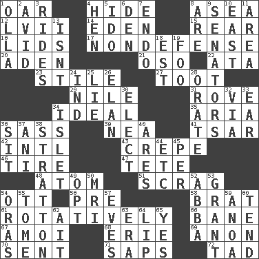 ACROSS 1. Boat paddle 4. Flintstone garb 8. At sea 12. 57 in ancient Rome 14. Locale of original sin 15. Tail end 16. Hats (slang) 17. Unrelated to defense, as in spending 20. An important port of Yemen 21. Bear (Spanish) 22. _ moment's notice (2 wds.) 23. Vertical member of a panel or frame 27. A blast of a horn 29. "Death on the ____" 31. Be footloose 34. Perfect 35. Roberta Peters solo 36. Backtalk 39. Teachers' org. 41. Russian ruler of old 42. International (abbr.) 43. Streamer paper 46. Hoop that covers a wheel 47. Wig 48. Smallest unit of an element 51. Strangle with an iron collar 54. Baseball player Mel 56. Before (prefix) 58. Naughty child 61. Rotating or pertaining to rotation 66. Object of repulsion 67. Mine, in Marseilles 68. 4th largest of the Great Lakes 69. At once, immediately (arch.) 70. Transmitted 71. Plant excrements 72. Small boy DOWN 1. Spanish pot 2. Enthusiastic 3. Amusement-park features 4. Layer 5. Wedding promise 6. Lair 7. Inside; within (prefix) 8. "We ___ not amused" (Victoria) 9. Elected representatives 10. Compass direction 11. Length times width 13. Is not 18. Eastern Standard Time (abbr.) 19. Egg _ yung 24. Working for oneself (abbr.) 25. Falsehood 26. Style 28. Declaim 30. Opt 32. By way of 33. Hearing organ 34. Small island 36. Be seated 37. Cuckoo 38. Ski resort town in Vermont 40. Ancient Greek god of war 44. And so on (abbr.) 45. For each 49. Elect 50. Medical imaging device (abbr.) 52. Swedish rock group 53. Monetary aid 54. Mouths or openings 55. Heavy book 57. Nights before holidays 59. Small Philippine buffalo 60. Be inclined (to) 62. Small island 63. Period 64. Mouth edge 65. Affirmative reply