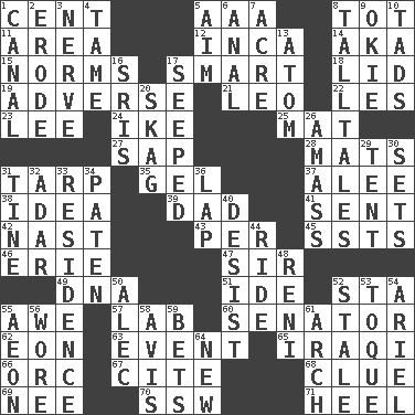 ACROSS 1. Penny 5. Auto club (abbr.) 8. Small child 11. Type of rug 12. South American Indian 14. Alias (abbr.) 15. Typical models 17. Don Adams' spy role 18. Flaplike covering 19. Contrary to your interests or welfare 21. Lion 22. French article 23. Area sheltered from the wind 24. D.D.E's nickname 25. Floor protector 27. Plant excrement 28. Floor coverings 31. Canvas cover 35. Set 37. Toward shelter 38. The main thing one is thinking about 39. Male parent 41. Emitted 42. Political cartoonist Thomas 43. For each 45. Fast planes 46. 4th largest of the Great Lakes 47. Title for a knight 49. Heredity factor (abbr.) 51. Binary compound 52. R.R. building 55. Deep reverence 57. Experiment locale 60. Legislator 62. A really long time 63. Incident 65. Resident of Iraq 66. The grampus (Milton) 67. Quote 68. A slight indication 69. Born 70. Compass dir. 71. Person who is morally reprehensible DOWN 1. Lessep's creation 2. Wear away 3. Impudent aggressiveness 4. Docile 5. Direct toward a target or goal 6. Of or related to the anus 7. 1/640 square mile 8. Baron Munchausen's specialties 9. Migrant worker of the '30s 10. Bits 13. Smallest unit of an element 16. Indian titles of respect 17. Oozed 20. Heroin 26. Collect or gather 29. Portable shelter 30. Puts into a specified state 31. Prong on a fork 32. The sixth month of the Jewish calendar 33. Dwelling 34. Eucharist need 36. Pet locale 40. Cease 44. Travel on an animal 48. Painter Guido (1575-1642) 50. Actor Baldwin 52. Lacking originality or spontaneity 53. Woman's close-fitting hat 54. Satellite of Uranus 55. A really long time 56. Had on 58. Deliberation 59. Wagers 61. Bowlike part 64. ___ Haven, CT