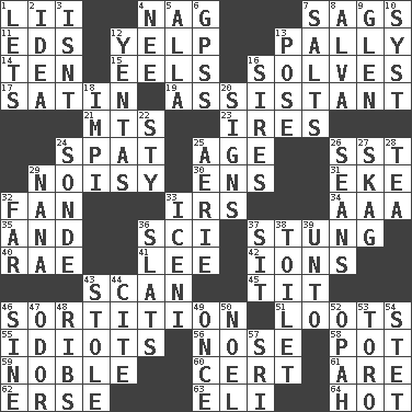 ACROSS 1. Cards in a Roman deck? 4. Tired old horse 7. Settles 11. Begley and Asner 12. Sharp bark 13. Chummy 14. "___ Little Indians" 15. Snakelike fish 16. Finds the solution 17. Smooth fabric 19. Helper 21. Mountains (abbr.) 23. Angers 24. Argument over a trivial matter 25. Personal question 26. Fast jet (abbr.) 29. Annoyingly loud 30. Followers of ems 31. Supplement with great effort 32. Air blower 33. Big collection agency 34. American Automobile Association (abbr.) 35. Plus 36. _-fi 37. Feeling sharp psychological pain 40. Actress Charlotte 41. Area sheltered from the wind 42. Charged particles 43. Skim 45. Teat (slang) 46. Drawing lots 51. Plunders 55. Foolish or stupid persons 56. Sense of smell 58. Plant holder 59. Having high moral qualities 60. Foregone conclusion 61. "We ___ not amused" (Victoria) 62. Celtic language 63. Biblical high priest 64. Being at a high temperature DOWN 1. Allows 2. The content of cognition 3. Is not 4. Born 5. Silent film actress Nazimova 6. Global Positioning Systems (abbr.) 7. Table seasonings 8. Inventor's middle name 9. Small, secluded valley 10. System (abbr.) 12. Gossips 13. Airs 16. Founders of families 18. Body of Kaffir warriors 20. Omens 22. Filthy place 24. Message 25. Nest on high 26. Actors Connery and Penn 27. Heroin 28. Beverage made from leaves 29. Grandmother 32. Distant 33. Ancient Celtic tribe of eastern Britain 36. Narrow boards 37. Be seated 38. Bathroom 39. To (old English) 43. Fur scarf 44. Quote 46. Trig term 47. Aroma 48. Chest bones 49. Single time 50. Christmas carol 52. Brightly colored fish 53. "Corrida" creature 54. Proofreading order 57. Indian title of respect (Mr.)