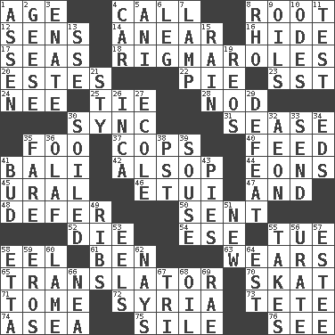 ACROSS 1. Personal question 4. Give a ring to 8. Carrot, for example 12. Elected reps. 14. Approach 16. Flintstone garb 17. Oceans 18. Frustrating wastes of time 20. _____ Park, CO 22. Sliced dessert 23. Fast jet (abbr.) 24. Born 25. Neckwear 28. Dreamland 30. Synchronize (abbr.) 31. Gospel singer Marvin 35. Egg _ yung 37. 911 reaches them 40. Nourish 41. Indonesian resort city 42. Columnist Joseph or Stewart 44. Immeasurably long periods of time 45. Mountain range 46. Needle case 47. Also 48. Put off 50. Posted 52. Expire 54. Compass dir. 55. Third day of the wk. 58. Snakelike fish 61. Benjamin's nick name 63. Puts on (as clothing) 65. Interpreter 70. Three-handed card game 71. Heavy book 72. Damascus' land 73. False hair 74. At sea 75. Filth; sediment 76. Observe DOWN 1. NE Netherlands city 2. Honkers 3. Related on the mother's side 4. Automobile 5. Black tropical American cuckoo 6. Part of a journey 7. Desk light 8. 17th letter of the Greek alphabet 9. Petroleums 10. Lyric poems 11. Trial 13. Compass dir. 15. Precipitation 19. Vintage cars 21. Filthy place 26. South American Indian 27. Learning spot: Fr. 29. Outscore 30. Dirtied 32. Period of immesurable duration 33. Post 34. Begley and Asner 35. Conductor's collection 36. Norwegian king 38. Pacific Standard Time (abbr.) 39. Lush 41. Partially opened flower 43. Sliced desserts 49. Chest bones 51. ___ Haven, CT 53. Snakelike fish 55. Receives possession of 56. A salt of uric acid 57. First name in cosmetics 58. Singer James 59. Greek god of love 60. Unable to walk 62. Negative votes 64. Eastern Standard Time (abbr.) 66. Teachers' org. 67. Three (prefix) 68. Lubricate 69. Actress Charlotte