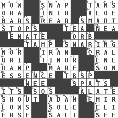 ACROSS 1. Cut the grass 4. Fastener 8. Scottish caps 12. Mouth or opening 13. To the inside or interior of 14. Medicinal plant 15. Oblong pieces of solid material 17. Stern 18. Don Adams' spy role 19. Obstructs or blocks passage 21. Beverage made from leaves 23. Teachers' org. 24. Related on the mother's side 26. Globe 28. Pack (down) 30. Catching in a trap 34. Not either 37. SW Asia republic 39. Taken by mouth 40. RI univ. 41. The easternmost of the Lesser Sundas 43. Compass dir. 44. Moist 46. Female horse 47. Manchild 48. Substance 51. Cook's measure (abbr.) 54. Born 55. Arguments over trivial matters 58. ___ a Wonderful Life 61. Mayday 63. Having winglike extensions 65. Yell 67. First man 71. Arab leader 72. Coldest temperatures 73. Flatfish 74. Connecticut Ivy Leaguer 75. Celtic language 76. Table seasoning 77. Observe DOWN 1. Crowds into 2. Speak pompously 3. Make _____ (do battle with) 4. Title for a knight 5. Compass dir. 6. "One Day ___ Time" 7. Left side of a ship or aircraft 8. Scottish cap 9. Actor Alda or Thicke 10. Greater amount 11. Stalk of a moss capsule 16. Petty quarrel 18. "Two Mules for Sister ____" 20. R.R. building 22. Period of immesurable duration 25. Send forth 27. Sis' sibling 29. First class 30. Derisive sound 31. Angers 32. Billionth: prefix 33. Small, secluded valley 34. Naked 35. Mouths or openings 36. Basketball hoops 38. Nursemaid (var.) 42. Confederate soldiers (slang) 45. Writing instrument 49. A home for chicks 50. Corporate head (abbr.) 52. Health resort 53. Light colored 56. Softens 57. Vertical member of a panel or frame 58. Small island 59. Son of Odin 60. Sty mamas 62. Backtalk 64. 4th largest of the Great Lakes 66. Purpose 68. ___ good deed 69. Everything 70. Was introduced to