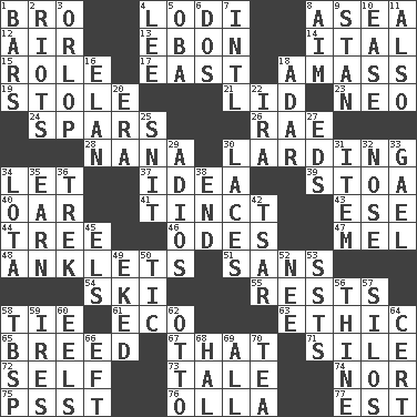 ACROSS 1. Sis' sibling 4. Farming town in central California 8. Toward the sea 12. Atmosphere 13. Inky black, to poets 14. Slanted text style (abbr.) 15. Hero or heavy, e.g. 17. Compass direction 18. Collect or gather 19. Took without asking 21. Hat (slang) 23. Modern: prefix 24. Practice fights 26. Actress Charlotte 28. Nanny 30. Preparing or cooking with lard 34. Allow 37. The main thing one is thinking about 39. Portico 40. Rowing implement 41. Tinged 43. Compass dir. 44. Family _ (genealogy) 46. Lyric poems 47. Cartoonist voice _ Blanc 48. Short socks 51. Without 54. What Jean-Claude Killy likes to do 55. Musical pauses 58. Make a knot 61. Environmental prefix 63. Principle of right and wrong 65. A special lineage 67. Not this but _ 71. Filth; sediment 72. Automatic 73. Story 74. And not 75. Inconspicuous attention getter 76. Rounded earthenware pot or jar 77. Eastern Standard Time (abbr.) DOWN 1. Soap units 2. Debaucheries 3. Lowest deck of a ship 4. Area sheltered from the wind 5. Chief or king in Benin or Nigeria 6. Two (Sp.) 7. International (abbr.) 8. Direct toward a target or goal 9. Comedian Laurel of Laurel & Hardy 10. Comfort 11. In addition 16. Flair 18. The sixth month of the Jewish calendar 20. Epoch 22. Lyricist Gershwin 25. In a ____ (agitated or irritated) 27. Begley and Asner 29. Goodbye (Sp.) 30. Shoestrings 31. A distinct part 32. Sense of smell 33. Highlander 34. Globular water bottle used in Asia 35. Merit 36. Long journey 38. Conclusion 42. Russian ruler of old 45. Raised railways 49. Supplemented with great effort 50. Nervous spasm 52. Born 53. Fast planes 56. One or ones belonging to thee 57. Grain storage towers 58. Cook's measure (abbr.) 59. Angers 60. Snakelike fish 62. Von Bismarck 64. Foregone conclusion 66. Lizard (obsolete) 68. Actor Linden 69. Everything 70. Afternoon social gathering