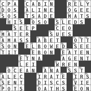 ACROSS 1. Numbers guy (abbr.) 4. Small house or cottage 9. Depend 13. Two (Sp.) 14. Place in a line 15. Double curve, resembling the letter S 16. Distress signal 17. Sadhe (variant) 18. Floor protectors 19. Part of HMS, perhaps 21. Bear (Spanish) 22. Bobsleighs 24. Ooze 26. Corporate head (abbr.) 27. Mother 29. Takes to court 30. Collect or gather 31. Collude with 33. Baseball player Mel 36. Boy, to dad 37. Turned at an angle; bent 40. Perceive with the eye 41. Teat (slang) 42. Inky black, to poets 43. Consumed 45. Inactive volcano in Sicily 47. Rep 48. Flowery wreath 49. Songbird 50. Sea 52. Santa ___, CA 54. Fast jet (abbr.) 56. Actor Baldwin 57. Feeling or showing extreme anger 59. Big collection agency 61. Posted 62. Flat circles 63. Compete 64. Cooking vessels 65. Curses 66. Period of immesurable duration DOWN 1. Music discs 2. "Silly old bear" 3. Aide 4. Feline 5. Columnist Joseph or Stewart 6. Prejudice 7. Southeast Asian peninsula 8. Born 9. Lover boys 10. Mild oath 11. Allows 12. Consenting reply 20. Observes 22. Snake scale 23. Area sheltered from the wind 25. Celtic language 27. Vertical spar for supporting sails 28. Mine, in Marseilles 29. Stitched 31. Swedish rock group 32. Surprise greeting 33. Clearly or manifestly demonstrative 34. Adolescent 35. Portable shelter 38. Soviet premier 1918-24 39. Letter starter 44. Grows older 45. Chooses 46. Afternoon social gathering 49. Timepiece 50. Butter sub 51. Penny 52. Roberta Peters solo 53. Political cartoonist Thomas 55. Musical group of three 56. Cleo's killer 57. Wedding promise 58. Curvy letter 60. Elected rep.