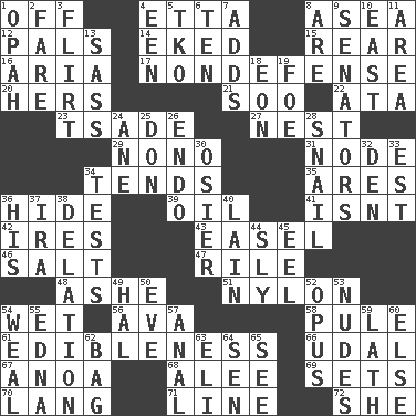 ACROSS 1. Not in operation 4. Singer James 8. Toward the sea 12. Friends 14. Made supply last 15. Stern 16. Roberta Peters solo 17. Unrelated to defense, as in spending 20. Possessive pronoun 21. "Barney Miller" actor Jack 22. "One Day ___ Time" 23. Sadhe (variant) 27. A home for chicks 29. Words to Nanette 31. Thickened enlargement 34. Watches over 35. Ancient Greek god of war 36. Flintstone garb 39. Petroleum 41. Is not 42. Angers 43. Artist's stand 46. Table seasoning 47. Cause heat under the collar 48. American tennis player Robert 51. Thermoplastic polyamide 54. Soggy 56. Actress Gardner 58. Whimper 61. The property of being fit to eat 66. Freehold land 67. Small Philippine buffalo 68. Toward shelter 69. Puts into a specified state 70. Long (Scottish) 71. Actor's bit 72. A female animal or person DOWN 1. Brightly colored fish 2. Conductor's collection 3. Talk or behave amorously 4. Car or cant ending 5. Ring climax 6. Nine, plus one 7. Does sums 8. "We ___ not amused" (Victoria) 9. Legislators 10. 90 degrees 11. Length times width 13. Backtalk 18. Period of immesurable duration 19. Enemy 24. A saturated hydrocarbon 25. Spanish title 26. Inside; within (prefix) 28. Slow-paced one 30. Flexible twig of a willow tree 32. Lair 33. Eastern Standard Time (abbr.) 34. Trials 36. Part of HMS, perhaps 37. Retirement account (abbr.) 38. Accusation by an informer 40. (Had) reclined 44. Insidious 45. Snakelike fish 49. Actor Linden 50. Night before a holiday 52. Musical composition 53. Unadorned figures 54. Welt 55. Pulitzer Prize-winning author Ferber 57. Of or related to the anus 59. Thin strip of wood or metal 60. Otherwise 62. Paper or plastic container 63. Connecticut Ivy Leaguer 64. Elected rep. 65. Observe