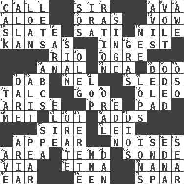 ACROSS 1. Give a ring to 5. Title for a knight 8. Actress Gardner 11. _ vera 12. Mouths or openings 14. Solemn pledge 15. Schedule 17. Suttee (variant) 18. The longest river in the world 19. Sunflower state 21. Eat 23. River (Sp.) 25. Legendary monster 26. Of or related to the anus 27. Teachers' org. 28. Surprise greeting 31. Apply (a substance) by light strokes 33. Cartoonist voice _ Blanc 35. Bobsleighs 37. Baby powder 38. Thick or sticky substance 40. Margarine 41. Get up 43. Before (prefix) 45. Groovy apt. 46. Was introduced to 47. Car dealer's back yard 50. Does sums 52. The founder of a family 53. Flowery wreath 54. Seem 56. Annoying sounds 61. Type of rug 62. Look after 65. Message 66. By way of 67. Inactive volcano in Sicily 68. Nanny 69. Hearing organ 70. Car or cant ending 71. Coast Guard woman DOWN 1. Keg 2. Silent film actress Nazimova 3. Grant temporary use of 4. Allows 5. Mayday 6. Retirement account (abbr.) 7. Food allowance for one day 8. Deliberation 9. Electrical Unit 10. Deep reverence 13. Scorch 16. Merit 18. Born 20. Thailand, formerly 22. Pate de foie ____ 24. Cassini of fashion 26. Lettered men learn these first 28. Actor Lugosi 29. Wrote a lyric poem 30. Bear (Spanish) 31. Have the gumption 32. Came down and settled, as after flight 34. Trim (branches) 36. Chops off 37. Scottish cap 39. Spoken 42. Writer Wiesel 44. Genesis locale 48. Declaim 49. Cylindrical with tapered ends 51. "Vaya con ____" 52. Health resort 54. Operatic vocal solo 55. Lightbulb-shaped fruit 57. Charged atoms 58. Fastener 59. Pulitzer Prize-winning author Ferber 60. Scorch 61. "___ Maria" 63. Compass dir. 64. Daniel's nick name