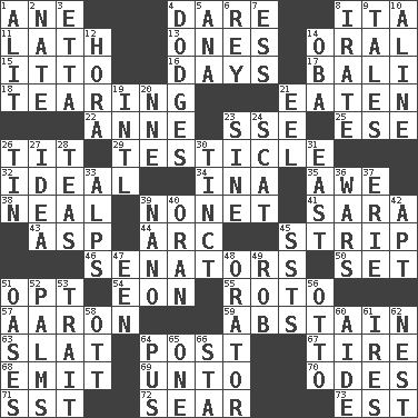 ACROSS 1. One (Scot) 4. Have the gumption 8. Call ___ day 11. Thin strip of wood or metal 13. Singles 14. Spoken 15. "Tell ____ the Marines!" 16. 24-hour periods 17. Indonesian resort city 18. Separating forcefully 21. Eroded 22. Singer Murray 23. Compass dir. 25. Compass dir. 26. Teat (slang) 29. One of the two male reproductive glands 32. Perfect 34. _ tizzy (2 wds.) 35. Deep reverence 38. Be tempered by heat 39. Music written for nine 41. "Two Mules for Sister ____" 43. Viper 44. Curve 45. Long narrow piece of something 46. Elected representatives 50. Put into a specified state 51. Elect 54. A really long time 55. Printing process, for short 57. Composer Copland 59. Refrain by choice 63. Narrow board 64. Mail 67. Hoop that covers a wheel 68. Send forth 69. To (old English) 70. Lyric poems 71. Fast jet (abbr.) 72. Wither 73. Eastern Standard Time (abbr.) DOWN 1. Came down and settled, as after flight 2. Nathan's nickname 3. Singer James 4. Evades 5. Santa ___, CA 6. Marina Del _, California 7. Curvy letter 8. Feeling or showing extreme anger 9. Falsehoods 10. Place in a line 12. Israeli folk dance 14. Chief or king in Benin or Nigeria 19. International (abbr.) 20. Compass dir. 21. Snakelike fish 23. Trig term 24. Get outta here! 26. Shallow baking pan 27. The content of cognition 28. Beverages made from leaves 30. A color or tint 31. 90 degrees 33. High mountains 36. Armed conflicts 37. One of the Great Lakes 39. Billionth: prefix 40. Northwest Algerian city 42. Fitting 45. Fast planes 47. Car or cant ending 48. Speaker 49. Director Reiner 51. Fertile tracts in a desert 52. Insides of hands 53. Distinguishing feature 56. Von Bismarck 58. Baseball player Mel 60. Helper 61. Angers 62. Egg locale 64. Product of festering 65. Single 66. R.R. building
