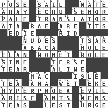 ACROSS 1. Introduce or present, as a question 5. Travel by water 9. Nathan's nickname 13. Like ___ of sunshine 14. Shade of tan 15. Sir (Sp.) 16. Diluted with white 17. Interpreter 19. _ moment's notice (2 wds.) 20. Actress Charlotte 21. "We ___ not amused" (Victoria) 22. ___ a Wonderful Life 23. Singer Brickell 25. To free from 26. Unadorned figures 30. Russian ruler of old 34. Phillipine bananalike plant 35. Opening into or through something 36. Style 39. Music written for nine 42. Hero or heavy, e.g. 43. Trig term 44. Laconic 46. Lacerate 47. Place in a line 48. Big _ 51. Small island 54. Beverage made from leaves 57. Wet nurse (var.) 58. Dripping 60. Make supply last 62. Abnormally rapid or deep breathing 65. Tending to cause great harm 66. Get up 67. Pismires 68. Not women's 69. Beverages made from leaves 70. For fear that 71. Goad DOWN 1. Dad 2. Declaim 3. First course 4. Sight organ 5. Bristle 6. 1/640 square mile 7. Lyricist Gershwin 8. Type of eclipse 9. Teachers' org. 10. Against 11. A blast of a horn 12. Blunders 15. Downhill vehicle 18. _ Lanka 20. Reuben's nickname 24. More empty; more void 27. Daniel's nick name 28. Environmental prefix 29. Before Barbara or Clara 30. Threesomes 31. "Barney Miller" actor Jack 32. 100% 33. To sift 36. Eastern Standard Time (abbr.) 37. Whopper 38. Santa ___, CA 40. Snakelike fish 41. Three (prefix) 45. In a ____ (agitated or irritated) 48. Female horse 49. Electrical Unit 50. Lessep's creation 52. Crowbar 53. Supplementing with great effort 54. Not this but _ 55. Jane of fiction 56. Capital of Western Samoa 58. Soaks 59. Compass direction 61. Otherwise 63. Curvy letter 64. Single 65. Australian flightless bird