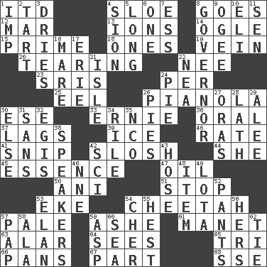 ACROSS 1. It would 4. A type of plum 8. Travels 12. Third mo. 13. Charged particles 14. Stare at amorously 15. A-one 18. Singles 19. Distinctive style or manner 20. Separating forcefully 22. Born 23. Indian titles of respect 24. For each 25. Snakelike fish 26. Player piano 30. Compass dir. 33. Bert's buddy 36. Of the mouth 37. Fails to keep up a pace 39. Frozen water 40. Assign a rank or rating to 41. Sever or remove by pinching or nipping 42. Agitate, as a liquid 44. A female animal or person 45. Center 47. Petroleum 50. Cuckoo 51. Cease 53. Make supply last 54. Leopard's kin 57. Light colored 59. American tennis player Robert 61. French painter Edouard 63. Having or resembling wings 64. Perceives with the eye 65. Three (prefix) 66. Zero-star reviews 67. Role in a play 68. Compass dir. DOWN 1. Mischievous child 2. Small pie 3. Frees from moisture 4. The Jewish people; Israel 5. Protracted 6. Single 7. Curvy letter 8. Head of state? 9. Double curve, resembling the letter S 10. Connecticut Ivy Leaguer 11. Elected rep. 16. Female horse 17. One of the Great Lakes 21. Capri or Wight 22. Teachers' org. 24. Sliced dessert 26. Sliced desserts 27. Mouths or openings 28. Thin strip of wood or metal 29. Toward shelter 30. Otherwise 31. Without 32. The front part of a cuirass 34. Cause heat under the collar 35. Non-commissioned officer (abbr.) 38. Orators 42. _-fi 43. Stockings 46. Compass dir. 48. Detail 49. Globular water bottle used in Asia 52. Leg coverings 53. Enthusiasm 54. "Mermaids" star 55. Behest 56. Possessive pronoun 57. Infant food 58. Insect wing 59. Viper 60. Ocean 62. Standoff