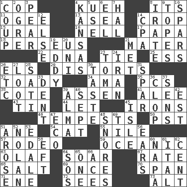 ACROSS 1. Police officer (slang) 4. Malaysian steamed pastry 8. It is 11. Double curve, resembling the letter S 13. Toward the sea 14. Riding implement 15. Mountain range 16. 1994 drama film starring Jodie Foster 17. Dad 18. Son of Zeus who helped slay Medusa 21. Mother 22. Pulitzer Prize-winning author Ferber 23. Standoff 25. Double-curved letter 26. Raised railways 29. What propaganda does 32. Sycophant 34. Nanny (var.) 35. Personal Computers (abbr.) 38. ____ d'Azur (French Riviera) 39. NE Netherlands city 41. Toward shelter 43. Shallow baking pan 44. Allow 45. Metal shackles 46. Storms 50. Pacific Standard Time (abbr.) 51. A saturated hydrocarbon 54. Feline 55. "Death on the ____" 57. Cowboy competition 59. Pertaining to the sea 63. Norwegian king 64. Fly high 67. Pace 68. Table seasoning 69. At one time in the past 70. Connect, as a bridge 71. Compass dir. 72. Perceives with the eye 73. Keyboard modifier key DOWN 1. Clever action or accomplishment 2. Legendary monster 3. Lightbulb-shaped fruit 4. Sunflower state 5. Purpose 6. Snakelike fish 7. Actor Linden 8. Feeling or showing extreme anger 9. Drinks excessively 10. Practice fights 12. Otherwise 14. Numbers guy (abbr.) 19. Whirlpool 20. University (slang) 21. Was introduced to 23. Heavy book 24. SW Asia republic 26. And so on (abbr.) 27. Plunder 28. Suttee (variant) 30. Clothes sense 31. Coast Guard woman 33. Undesirable depression on a surface 36. Hoof sound 37. Elected reps. 39. _ mater 40. Back-to-school mo. 42. Eastern Standard Time (abbr.) 45. Small island 47. Environmental prefix 48. Sounds asleep 49. Nervous spasm 51. Came up 52. Pitcher Ryan 53. Peak District village in England 56. Hearing organs 58. Lizard (obsolete) 60. California wine valley 61. Slanted text style (abbr.) 62. Penny 64. Distress signal 65. Single 66. Adept person