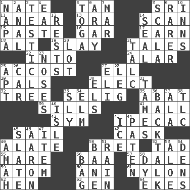 ACROSS 1. Nathan's nickname 5. Scottish cap 8. Indian title of respect (Mr.) 11. Approach 13. Mouth or opening 14. Glance over 15. Thick mixture 16. Slender fish 17. Merit 18. The first octave above the treble staff 19. Kill 21. Lies 22. To the inside or interior of 24. Having or resembling wings 25. Buttonhole 27. Pipe bend 29. Friends 30. Choose 32. Family _ (genealogy) 33. Major League Baseball Commissioner Bud 35. Blind as ____ 39. Beverly of Met fame 41. Promenade 42. Symbol (abbr.) 43. Medicinal drug used to evoke vomiting 45. Move on water 48. Keg 49. Having winglike extensions 50. Cy Young winner Saberhagen 52. Small boy 55. Female horse 56. Sound made by sheep 57. Peak District village in England 59. Smallest unit of an element 60. Cuckoo 61. High-strength synthetic material 62. Layer 63. Commissioned military rank (abbr.) 64. Makes supply last DOWN 1. California wine valley 2. Of or related to the anus 3. One of the two male reproductive glands 4. Erode 5. Ancient Roman robe 6. Like ___ of sunshine 7. Third mo. 8. Any of the three canals of the cochlea 9. More uncommon 10. Taverns 12. Musical pauses 14. Lick closed 20. Car dealer's back yard 21. Baby powder 23. Olfactory organs 25. Fitting 26. 4-wheeled motor vehicle 27. Connecticut Ivy Leaguer 28. Part of a journey 30. Raised railways 31. Domesticates 33. Mischievous 34. Shade tree 36. Sass 37. Wing 38. Affectionate concern, for short 40. Capri or Wight 43. Frozen water 44. Eucharist need 45. Chalkboard 46. Composer Copland 47. Detail 49. Housemaid 50. Object of repulsion 51. Water falling in drops from the sky 53. Medicinal plant 54. Hiding places for outlaws 56. Container for groceries 58. Color