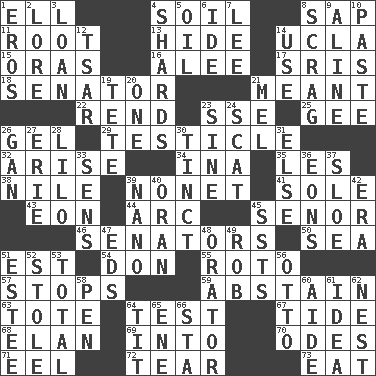ACROSS 1. Pipe bend 4. Earth 8. Plant excrement 11. Carrot, for example 13. Flintstone garb 14. Southern CA. univ. 15. Mouths or openings 16. Toward shelter 17. Indian titles of respect 18. Legislator 21. Intended 22. Tear apart 23. Compass dir. 25. Turn to the right 26. Set 29. One of the two male reproductive glands 32. Originate 34. _ tizzy (2 wds.) 35. French article 38. The longest river in the world 39. Music written for nine 41. Flatfish 43. A really long time 44. Curve 45. Sir (Sp.) 46. Elected representatives 50. Ocean 51. Eastern Standard Time (abbr.) 54. Spanish title 55. Printing process, for short 57. Ceases 59. Choose not to consume 63. Lug 64. Trial 67. Periodic rise and fall of the sea level 68. Flair 69. To the inside or interior of 70. Lyric poems 71. Snakelike fish 72. Separate forcefully 73. Erode DOWN 1. Greek god of love 2. Old wives' tales, e.g. 3. Grant temporary use of 4. Broken pieces 5. Lubricate 6. Binary compound 7. Area sheltered from the wind 8. Lean end of the neck 9. Place in a line 10. Thick mixture 12. Russian ruler of old 14. Purpose 19. Wig 20. Single 21. Cartoonist voice _ Blanc 23. Trig term 24. Go away! 26. Separate the seeds from cotton 27. One of the Great Lakes 28. _ and Stitch 30. A color or tint 31. Otherwise 33. Elected reps. 36. Immeasurably long periods of time 37. A type of plum 39. Billionth: prefix 40. NW Algerian seaport 42. Period 45. Fast planes 47. Begley and Asner 48. Speaker 49. Director Reiner 51. First name in cosmetics 52. Took without asking 53. Add up to 56. Von Bismarck 58. Writing instrument 60. Helper 61. The content of cognition 62. A home for chicks 64. Teat (slang) 65. Compass dir. 66. R.R. building