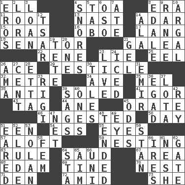 ACROSS 1. Pipe bend 4. Portico 8. Period 11. Carrot, for example 13. Political cartoonist Thomas 14. The sixth month of the Jewish calendar 15. Mouths or openings 16. Mitch Miller's instrument 17. Austrian-born American filmmaker Fritz 18. Legislator 21. An organ shaped like a helmet 22. French philosopher Descartes 23. Untruth 25. Snakelike fish 26. Adept person 29. One of the two male reproductive glands 32. Distance measurement (Brit.) 34. "___ Maria" 35. Cartoonist voice _ Blanc 38. Opposed to 39. Having a sole or soles 41. Composer Stravinsky 43. Label 44. A saturated hydrocarbon 45. Speak pompously 46. Eaten 50. 24 hours 51. Car or cant ending 54. Double-curved letter 55. Sight organs 57. Upward 59. Inhabiting a nest 63. General guideline 64. Saudi Arabian king (1953-1964) 67. Length times width 68. Dutch treat 69. Prong on a fork 70. A home for chicks 71. Lair 72. Among 73. A female animal or person DOWN 1. Greek god of love 2. Old wives' tales, e.g. 3. Grant temporary use of 4. Sounds asleep 5. Keyboard key 6. Bear (Spanish) 7. Had dinner 8. Peak District village in England 9. Indian princess (variant) 10. Therefore, facetiously 12. Russian ruler of old 14. In the manner of 19. False hair 20. Single 21. Set 23. Not recorded 24. On the rocks 26. Nanny (var.) 27. Penny 28. Singer James 30. Falsehoods 31. Arab leader 33. Swiss mountan, "Queen of the Mountains" 36. Mild oath 37. Globular water bottle used in Asia 39. Settles 40. Singles 42. Marina Del _, California 45. Lyric poems 47. Remaining after all deductions 48. Looked after 49. Sight organ 51. Having ears or earlike features 52. Dodge 53. Pitcher Ryan 56. Comedian Laurel of Laurel & Hardy 58. Opposite of masc. 60. Angers 61. Soft 62. Yard entry 64. R.R. building 65. Direct toward a target or goal 66. University (slang)