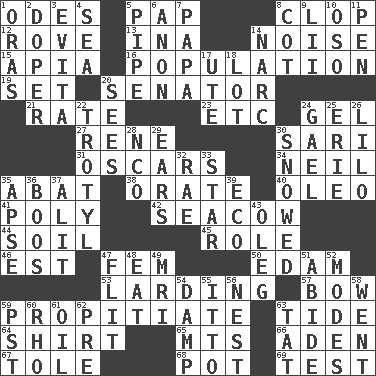 ACROSS 1. Lyric poems 5. Infant food 8. Hoof sound 12. Be footloose 13. _ tizzy (2 wds.) 14. Annoying sound 15. Capital of Western Samoa 16. Census information 19. Arrange properly for use 20. Legislator 21. Pace 23. And so on (abbr.) 24. Set 27. French philosopher Descartes 30. Indian skirt 31. Motion picture awards 34. Famous astronaut Armstrong 35. Blind as ____ 38. Speak pompously 40. Butter sub 41. Many (prefix) 42. Manatee 44. Land 45. Hero or heavy, e.g. 46. Eastern Standard Time (abbr.) 47. Opposite of masc. 50. Dutch treat 53. Preparing or cooking with lard 57. Arrow shooter 59. Appease 63. Event that recurs at intervals 64. Upper-body garment 65. Mountains (abbr.) 66. An important port of Yemen 67. Lacquered or enameled metalware 68. Plant holder 69. Trial DOWN 1. Mouths or openings 2. Drug addict 3. Webber/Rice musical 4. Ocean 5. Corncob 6. Soon (poet.) 7. Dad 8. Small bed 9. Cards in a Roman deck? 10. Bear (Spanish) 11. Animal enclosure 14. Drug cop 17. Shoshoni 18. Car dealer's back yard 20. Observes 22. Trinitrotoluene 24. Highlander 25. One of the Great Lakes 26. _ and Stitch 28. Non-commissioned officer (abbr.) 29. Hearing organs 30. Overwhelmed 32. Actress Charlotte 33. Play the lead 35. Domed church section 36. Scornful sounds 37. Came down and settled, as after flight 39. Environmental prefix 43. Cassini of fashion 47. Sudden quick movement 48. Ingest 49. Medical imaging device (abbr.) 51. Tolerate 52. Methods 54. Moist 55. "Tell ____ the Marines!" 56. A home for chicks 58. Left 59. Pacific Standard Time (abbr.) 60. 17th letter of the Greek alphabet 61. Lubricate 62. Before (prefix) 63. Make lace