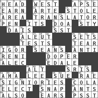 ACROSS 1. Froth on beer 5. 270 degrees 9. Domed church section 13. Merit 14. Johnson of "Laugh-In" 15. Took without asking 16. Length times width 17. Interpreter 19. Fenced enclosure 20. ___ a Wonderful Life 21. ___ good deed 22. Filthy place 23. Raised platform 25. Fast jet (abbr.) 26. Eskimo relative 30. Arranges properly for use 34. Trials 35. Rend 36. Russian composer Stravinsky 39. Actors Connery and Penn 42. Against 43. Painter Guido (1575-1642) 44. Drug addict 46. Actor Baldwin 47. Peak District village in England 48. Keyboard modifier key 51. Indian titles of respect 54. Nanny (var.) 57. Area sheltered from the wind 58. Take to court 60. Actress Charlotte 62. Seigniories (variant) 65. Root beer relative 66. Voters do this 67. Fastener 68. Pismires 69. In addition 70. Hearing organs 71. Inconspicuous attention getter DOWN 1. Pile 2. Having ears or earlike features 3. Sports stadium 4. Heredity factor (abbr.) 5. Electrical Unit 6. Blunders 7. R.R. building 8. Is inclined (to) 9. "One Day ___ Time" 10. Plant holders 11. Narrow opening 12. Suggestive of the supernatural 15. Narrow board 18. Mayday 20. Capri or Wight 24. Of or pertaining to medicine 27. Double-curved letter 28. Shoshoni 29. Sadhe (variant) 30. A viewer who gazes fixedly 31. Car or cant ending 32. Make lace 33. Indian title of respect (Mr.) 36. Lyricist Gershwin 37. Set 38. Single 40. Lower and raise head in agreement 41. Health resort 45. Otherwise 48. Set down 49. Lion 50. Laconic 52. Removes the wrinkles 53. Table seasonings 54. At sea 55. Place where flour is made 56. Eons 58. Scorch 59. United States Postal Service (abbr.) 61. Compass direction 63. Non-commissioned officer (abbr.) 64. _ tizzy (2 wds.) 65. Head covering