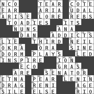 ACROSS 1. Non-commissioned officer (abbr.) 4. Pull apart 8. ____ d'Azur (French Riviera) 12. Hearing organ 13. Roberta Peters solo 14. Allodial 15. Ascend 18. Old wives' tales, e.g. 19. Confederate soldiers (slang) 20. Sycophants 22. ___ a Wonderful Life 23. Religious women 24. Santa ___, CA 25. One of the 12 tribes of Israel 26. Inveterate users 30. Untruth 33. One of three equal parts 36. Famous astronaut Armstrong 37. Gumbo ingredient 39. Mouth or opening 40. Trig term 41. Dormintory (informal) 42. Frolics 44. Directed 45. Motivate 47. Electrically charged atom 50. Environmental prefix 51. Pate de foie ____ 53. "We ___ not amused" (Victoria) 54. Elected representative 57. Inactive volcano in Sicily 59. Lightbulb-shaped fruit 61. Soviet premier 1918-24 63. To be drawn or hauled along 64. Painter Guido (1575-1642) 65. Ripen 66. Filth; sediment 67. Otherwise 68. River (Sp.) DOWN 1. Teachers' org. 2. Heavy open wagon 3. Constellation of myth 4. Story 5. Greek god of love 6. Atmosphere 7. Actress Charlotte 8. Window treatments 9. Lyric poems 10. Keyboard key 11. Raised railways 16. Saudi Arabian king (1953-1964) 17. Pulitzer Prize-winning author Ferber 21. Is not 22. Working for oneself (abbr.) 24. Find the sum of 26. Like ___ of sunshine 27. To provide with a ceiling 28. Prong on a fork 29. Downhill vehicle 30. Farming town in central California 31. Image 32. Blunders 34. Hollow 35. Lyricist Gershwin 38. Electrical Measurement 42. Adept person 43. Attach a signature 46. Frozen water 48. Relating to the mouth 49. Nathan's nickname 52. Echolocation 53. Of or related to the anus 54. Without 55. 4th largest of the Great Lakes 56. Swiss mountan, "Queen of the Mountains" 57. Begley and Asner 58. Three (prefix) 59. Before (prefix) 60. Snakelike fish 62. Modern: prefix