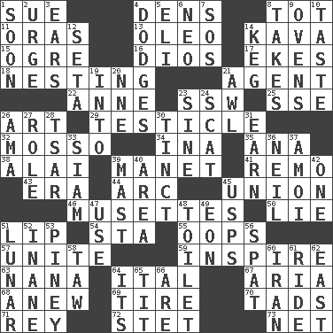 ACROSS 1. Take to court 4. Hiding places for outlaws 8. Small child 11. Mouths or openings 13. Butter sub 14. Polynesian shrub of the pepper family 15. Legendary monster 16. "Vaya con ____" 17. Makes supply last 18. Inhabiting a nest 21. Representative 22. Singer Murray 23. Compass dir. 25. Compass dir. 26. Nonscientific branch of learning 29. One of the two male reproductive glands 32. With motion or animation 34. _ tizzy (2 wds.) 35. Santa ___, CA 38. Jai _ 39. French painter Edouard 41. San ____ (Riviera town) 43. Epoch 44. Curve 45. The state of being joined or united 46. French bagpipes 50. Untruth 51. Mouth edge 54. R.R. building 55. I made a mistake 57. Join together 59. Stimulate to action 63. Grandmother 64. Slanted text style (abbr.) 67. Operatic vocal solo 68. Afresh 69. Hoop that covers a wheel 70. Small amounts or degrees 71. Marina Del _, California 72. Proofreading order 73. Fish or hair follower DOWN 1. Within a short period 2. Goad 3. Hearing organs 4. Evades 5. Biblical high priest 6. Modern: prefix 7. Mayday 8. Proceeds 9. Baking chambers 10. Clothes sense 12. Stalk of a moss capsule 14. Barrel 19. To the inside or interior of 20. Compass dir. 21. Leather borer 23. Trig term 24. Jazz singing style 26. Wet nurse (var.) 27. Hero or heavy, e.g. 28. Russian ruler of old 30. Tinged 31. Merit 33. Thailand, formerly 36. Famous astronaut Armstrong 37. Mine, in Marseilles 39. Vertical spar for supporting sails 40. Type of rug 42. Single 45. United States Postal Service (abbr.) 47. Purpose 48. Rest room 49. A really long time 51. Type of eclipse 52. Silly 53. Abounding in pines 56. Petty quarrel 58. The 23rd letter of the Hebrew alphabet 60. SW Asia republic 61. Travel on an animal 62. Compass direction 64. ___ a Wonderful Life 65. Teat (slang) 66. "We ___ not amused" (Victoria)