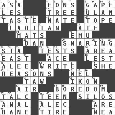 ACROSS 1. White ___ sheet 4. Immeasurably long periods of time 8. Yawn 12. French article 13. Family _ (genealogy) 14. ____ Bator 15. Clothes sense 18. Nathan's nickname 19. Drink excessively 20. Of or relating to Laos or its people 22. Had dinner 23. Floor coverings 24. Australian flightless bird 25. Daniel's nick name 26. Catching in a trap 30. R.R. building 33. Trials 36. Type of rug 37. Compass direction 39. Adept person 40. For fear that 41. Toward shelter 42. Compose 44. A female animal or person 45. Thinks logically 47. Cartoonist voice _ Blanc 50. The 23rd letter of the Hebrew alphabet 51. Image 53. Atmosphere 54. Mood resulting from idleness 57. Baby powder 59. Adolescent 61. Grain storage towers 63. Of or related to the anus 64. Actor Baldwin 65. "We ___ not amused" (Victoria) 66. Object of repulsion 67. Hoop that covers a wheel 68. Teachers' org. DOWN 1. Keyboard modifier key 2. Lick closed 3. Indian state 4. Inactive volcano in Sicily 5. Northwest Algerian city 6. Fish or hair follower 7. Perceive with the eye 8. From the throat 9. _ vera 10. Infant food 11. Compass dir. 16. Frog relative 17. Singer James 21. Is not 22. Wet nurse (var.) 24. Followers of ems 26. Proofreading order 27. Angers 28. Tender 29. Yard entry 30. Shrivel 31. Lie 32. At sea 34. Hearing organs 35. _-fi 38. A testis 42. Compass dir. 43. Independent ruler or chieftain 46. Rowing implement 48. Makes supply last 49. Farming town in central California 52. Pitcher Ryan 53. Actor Alda or Thicke 54. Fermented drink made from hops 55. At one time in the past 56. Greater amount 57. Keyboard key 58. Santa ___, CA 59. Make lace 60. Biblical high priest 62. Ocean