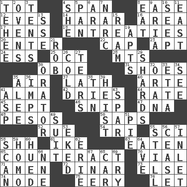 ACROSS 1. Small child 4. Connect, as a bridge 8. Relaxation 12. Nights before holidays 14. Ethiopian city, capital of Harari 16. Type of rug 17. Coop moms 18. Pleas 20. Keyboard key 22. Head covering 23. Fitting 24. Double-curved letter 25. Sep. follower 28. Mountains (abbr.) 30. Mitch Miller's instrument 31. Imelda's hoard 35. Atmosphere 37. Thin strip of wood or metal 40. Johnson of "Laugh-In" 41. _ mater 42. Frees from moisture 44. Assign a rank or rating to 45. Back-to-school mo. 46. Sever or remove by pinching or nipping 47. Heredity factor (abbr.) 48. Mexican monetary units 50. Plant excrements 52. Sorrow 54. Three (prefix) 55. _-fi 58. Quiet! 61. Eisenhower's nickname 63. Eroded 65. Neutralize 70. Small bottle 71. So be it 72. Middle Eastern gold or silver currency 73. Otherwise 74. Thickened enlargement 75. Suggestive of the supernatural 76. Allow DOWN 1. Giggle 2. Baking chambers 3. Portable shelters 4. A female animal or person 5. Baking dish 6. Tate display 7. Drug cop 8. Ingest 9. Roberta Peters solo 10. Ooze 11. Compass direction 13. Compass dir. 15. 480, 500 or 516 sheets of paper 19. Flats, for short 21. Director Reiner 26. Chilled 27. Separates forcefully 29. Pottery fragments 30. Speaker 32. NW Algerian seaport 33. Singer James 34. Perceive with the eye 35. Toward shelter 36. Naughty children 38. Shallow baking pan 39. Robbery 41. Viper 43. Practice fight 49. Costume for a special activity 51. Sliced dessert 53. Made supply last 55. Free from disturbance or agitation 56. Desist 57. An arm off of a larger body of water 58. Skim 59. Like (prefix) 60. Took on color 62. 4th largest of the Great Lakes 64. "___ Maria" 66. Compass dir. 67. One (Scot) 68. Automobile 69. Attempt