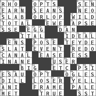 ACROSS 1. 17th letter of the Greek alphabet 4. Elects 8. Elected rep. 11. Merit 13. Seines 15. Modern: prefix 16. Thick slice 17. Lowest deck of a ship 18. Rampant 19. Add up to 21. She-sheep 22. Domed church section 23. Compass dir. 24. Ovum 27. Daniel's nick name 29. Slanted text style (abbr.) 30. Perfect 34. Followers of ems 36. Introduce or present, as a question 39. Miss Universe 1986, Barbara Palacios _ 40. Narrow board 41. Happening 43. Make new 44. Lessep's creation 46. Comfort 47. Curvy letter 48. Silly 49. One who uses or employs something 51. Of large size 53. And so on (abbr.) 54. Air pressure measure (abbr.) 57. He sold his birthright 60. Elect 63. Stares 65. Deli pickle 66. Failure 69. Shout 70. Cuckoo 71. Movie unit 72. Diluted with white 73. Was introduced to 74. Loyal 75. Fast jet (abbr.) DOWN 1. Musical pauses 2. Rings 3. Speak pompously 4. Bear (Spanish) 5. For each 6. Lie 7. Frozen precipitation 8. Sever or remove by pinching or nipping 9. Snakelike fish 10. Connecting point 12. Basketball assoc. 14. Hurried 18. Nomad 20. Allow 25. Open wide 26. Michael Jackson trademark 28. Small island 29. Byzantium, centuries later 31. Sight organs 32. Sums up 33. Lion 34. Liveliness 35. Nanny 37. Ocean 38. Follow as a consequence or result 40. _-fi 42. Trial 45. Flowery wreath 50. Environmental prefix 52. _ course 54. Entreaties 55. Makes a sale 56. Small island 57. Dutch treat 58. Trig term 59. Set down 61. Left side of a ship or aircraft 62. Russian ruler of old 64. Swindle 67. Australian flightless bird 68. To separate or throw off