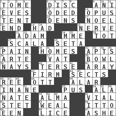 ACROSS 1. Heavy book 5. Plate 9. Black tropical American cuckoo 12. Nights before holidays 13. Wrote a lyric poem 14. Musical composition 15. Portable shelter 16. Cub Scout units 17. Christmas carol 18. Conclude 19. Possessed 21. Boldness 22. First of billions? 24. Madame (abbr.) 26. Small child 27. Any of the three canals of the cochlea 28. Bristle 29. Ache 30. Dwellings 32. Tenement units (abbr.) 36. Johnson of "Laugh-In" 37. Large container 38. Soup holder 39. Negative votes 40. Laconic 42. Like ___ of sunshine 43. Securely fixed in place 44. Religious groups 46. To sift 49. Baseball player Mel 50. Having or resembling wings 51. Silly 53. Fluid product of inflammation 54. Wing 57. Nathan's nickname 58. _ mater 61. Small bottle 62. Proofreading order 63. Welt 64. "Tell ____ the Marines!" 65. Car or cant ending 66. Louse (plural) 67. American tennis player Robert DOWN 1. False hair 2. Baking chamber 3. Ananias' fault 4. Eastern Standard Time (abbr.) 5. Texas town _ City 6. Binary compound 7. Elected rep. 8. Music discs 9. To the left, to Queeg 10. New (sp.) 11. Small island 14. Single 19. Actor Linden 20. Wet nurse 21. Teachers' org. 23. Natives or inhabitants of Denmark 24. Confronts 25. Mountains (abbr.) 27. "Two Mules for Sister ____" 28. Excessive but superficial compliments 29. Baking dish 31. Unconcealed 32. Phillipine bananalike plant 33. Likenesses of persons 34. It was, poetically 35. Cunning 40. Teat (slang) 41. Son of Isaac 43. Enemy 45. Raised railways 46. Wash lightly 47. Related on the mother's side 48. Eroded 52. Fish or hair follower 53. Light colored 55. Thin strip of wood or metal 56. Medicinal plant 58. Leather borer 59. Luau accessory 60. Apple computer (short form) 61. By way of