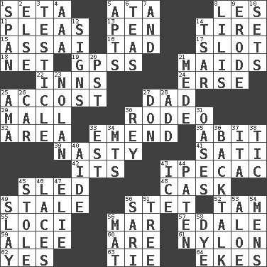 ACROSS 1. Bristle 5. "One Day ___ Time" 8. French article 11. Entreaties 13. Fenced enclosure 14. Hoop that covers a wheel 15. Slender Brazilian palm 16. Bit 17. Notch 18. Remaining after all deductions 19. Global Positioning Systems (abbr.) 21. Women servants 22. Restaurants 24. Celtic language 25. Buttonhole 27. June honoree 29. Promenade 30. Cowboy competition 32. Type of rug 33. Make improvements or corrections to 35. "This won't hurt ____!" 39. Thoroughly unpleasant 41. Suttee (variant) 42. ___ a Wonderful Life 43. Medicinal drug used to evoke vomiting 45. Downhill vehicle 48. Keg 49. Lacking originality or spontaneity 50. Proofreading order 52. Scottish cap 55. Venues 56. Impair 57. Peak District village in England 59. Toward shelter 60. "We ___ not amused" (Victoria) 61. Thermoplastic polyamide 62. Consenting reply 63. Make a knot 64. Makes supply last DOWN 1. Connect, as a bridge 2. Otherwise 3. One of the two male reproductive glands 4. Auto club (abbr.) 5. Tenement units (abbr.) 6. Beverages made from leaves 7. Also 8. Ms. Damita and namesakes 9. Eat (away) 10. Puts into a specified state 12. Signals 14. Russian ruler of old 20. Pacific Standard Time (abbr.) 21. Ancient Persian 23. Pitcher Ryan 25. Nursemaid (var.) 26. Auto 27. Spanish title 28. Increase 30. Marina Del _, California 31. Fertile tracts in a desert 33. Eastern Standard Time (abbr.) 34. Mountains (abbr.) 36. Sass 37. Call ___ day 38. Nervous spasm 40. Assistant 43. Frozen water 44. Eucharist need 45. Fur scarf 46. Shoestrings 47. Writer Wiesel 49. Kill 50. Indian skirt 51. Family _ (genealogy) 53. _ vera 54. Not women's 56. Floor protector 58. Color