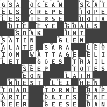 ACROSS 1. Girls' org. (abbr.) 4. Sea 9. Go away! 13. Raised railways 14. Streamer paper 15. Drink excessively 16. French article 17. Laconic 18. Roll call or roster of names 19. Pass on 21. Sight organ 22. Purposes of endeavors 24. Neighbor of Neb. 26. University (slang) 27. Smooth fabric 29. Small, secluded valley 30. Having winglike extensions 31. "Two Mules for Sister ____" 33. Lion 36. Electrically charged atom 37. Electrical Measurement 40. Connecticut Ivy Leaguer 41. Allow 42. Moves 43. Go after with the intent to catch 45. Ooze 47. Hauls 48. Period of immesurable duration 49. Thin strip of wood or metal 50. Obtain by seizing forcibly or violently 52. Luau accessory 54. Layer 56. Frog relative 57. Singer Mel 59. Hit sharply and swiftly 61. Johnson of "Laugh-In" 62. Off-Broadway awards 63. Compass dir. 64. Fermented drink made from hops 65. Honkers 66. One of the 12 tribes of Israel DOWN 1. Set 2. Downhill vehicle 3. Aide 4. Sep. follower 5. Small stream 6. Suggestive of the supernatural 7. Domed church section 8. Born 9. Put through a sieve 10. Calm and collected 11. Flats, for short 12. Afternoon social gathering 20. Prepare for publication 22. Russian prison camp 23. Single 25. Afresh 27. Travel by water 28. Medicinal plant 29. Pate de foie ____ 31. Constrict 32. Had dinner 33. Tough but pliablecoriaceous 34. Writer Wiesel 35. Petroleums 38. Rep 39. Singer James 44. Writer of Portnoy's Complaint (1969) 45. Sowing specialist 46. Greek goddess of the dawn 49. Citrus fruits 50. Had on 51. Assign a rank or rating to 52. Ear part 53. One of the Great Lakes 55. Grandmother 56. Bar bill 57. Coat; cloak 58. Compass dir. 60. Animal enclosure