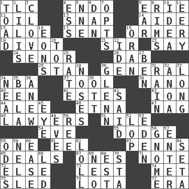 ACROSS 1. Affectionate concern, for short 4. Inside; within (prefix) 8. 4th largest of the Great Lakes 12. Lubricate 13. Fastener 14. Assistant 15. _ vera 17. Emitted 18. Channel Islands abalone 19. A piece of turf (Scot.) 21. Title for a knight 23. Declare 24. Sir (Sp.) 26. Small moist lump or mass 28. Comedian Laurel of Laurel & Hardy 30. Commissioned military rank 34. Basketball assoc. 37. Implement 39. Billionth: prefix 40. Car or cant ending 41. _____ Park, CO 43. Electrically charged atom 44. Toward shelter 46. Inactive volcano in Sicily 47. Tired old horse 48. Those who practice law 51. Mediterranean tributary 54. Night before a holiday 55. Evade 58. Single 61. Snakelike fish 63. Actor Sean's family 65. Allots cards 67. Singles 71. Make mention of 72. Otherwise 73. For fear that 74. Was introduced to 75. Downhill vehicle 76. Globular water bottle used in Asia 77. Epoch DOWN 1. Frog relative 2. Ms. Damita and namesakes 3. Garlic unit 4. Curvy letter 5. Compass dir. 6. Daniel's nick name 7. Chooses 8. Ewer handle 9. Basketball hoops 10. It may be bright or harebrained 11. Suggestive of the supernatural 16. Immeasurably long periods of time 18. Northwest Algerian city 20. Small child 22. Binary compound 25. Pace 27. Benjamin's nick name 29. Olfactory organs 30. American astronaut and politician John 31. Water falling in drops from the sky 32. Small Philippine buffalo 33. Protracted 34. Anneal 35. Actor Lugosi 36. Afresh 38. Baseball player Mel 42. Stated 45. Sight organ 49. Nights before holidays 50. To riddle 52. Trim (branches) 53. Paradise 56. Dwarf 57. Keyboard key 58. Lyric poems 59. 1994 drama film starring Jodie Foster 60. Comfort 62. Hang loosely or laxly 64. Stalk of a moss capsule 66. Directed 68. Modern: prefix 69. Eastern Standard Time (abbr.) 70. R.R. building