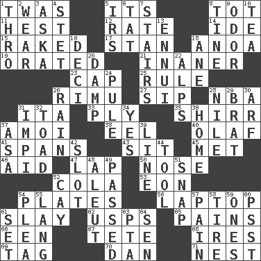 ACROSS 1. It was, poetically 5. It is 8. Small child 11. Command 12. Pace 14. Binary compound 15. Swept the length of 17. Comedian Laurel of Laurel & Hardy 18. Small Philippine buffalo 19. Declaimed 21. More empty; more void 23. Head covering 25. Governing power 26. Tall New Zealand timber tree 27. Small drink 28. Basketball assoc. 31. Call ___ day 33. Apply oneself diligently 35. Bake eggs in their shells 37. Mine, in Marseilles 38. Snakelike fish 40. Norwegian king 41. Connects, as a bridge 43. Be seated 45. Was introduced to 46. Help 47. Infant locale 50. Olfactory organ 52. Root beer relative 53. A really long time 54. Food holders 56. Portable computer 61. Kill 62. United States Postal Service (abbr.) 65. Aches 66. Car or cant ending 67. False hair 68. Angers 69. Label 70. One of the 12 tribes of Israel 71. Egg locale DOWN 1. Through, poetically 2. Put on (as clothing) 3. "____ silly question..." 4. Proofreading order 5. Big collection agency 6. Make lace 7. Flight of steps 8. Prong on a fork 9. Scent 10. Beverage made from leaves 13. World-weariness 16. Tenth: prefix 18. A saturated hydrocarbon 20. Moist 22. High mountains 24. Whimper 26. Water falling in drops from the sky 28. Mediterranean tributary 29. Naughty child 30. Sandy's bark 31. Body of Kaffir warriors 32. Frog relative 34. Affirmative reply 36. Dwelling 37. White ___ sheet 39. Actor's bit 42. Notch 44. Instrument 48. Eskimo relative 49. Went by 51. Fastener 52. Island 54. Entreaty 55. Long (Scottish) 57. Ache 58. Become fatigued 59. Washington bills 60. Inconspicuous attention getter 61. Arrange properly for use 63. Parent Teacher Assoc. 64. Elected rep.