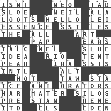 ACROSS 1. Is not 5. Modern: prefix 8. Bit 11. _ gin 12. Famous astronaut Armstrong 14. Insect wing 15. Plunders 17. Phone greeting 18. Flowery wreath 19. Substance 21. Fast jet (abbr.) 22. French article 23. Definite Article 24. 100% 25. Nonscientific branch of learning 27. Infant food 28. Hearing organs 31. Baby powder 35. Cartoonist voice _ Blanc 37. Change direction abruptly 38. The content of cognition 39. River (Sp.) 41. Portable shelter 42. Lightbulb-shaped fruit 43. Lyricist Gershwin 45. Fast planes 46. International (abbr.) 47. The first octave above the treble staff 49. Being at a high temperature 51. The 23rd letter of the Hebrew alphabet 52. R.R. building 55. Frozen water 57. Black tropical American cuckoo 60. Speakers 62. Third mo. 63. Mother 65. Grain storage towers 66. Before (prefix) 67. Comedian Laurel of Laurel & Hardy 68. French philosopher Descartes 69. It would 70. Raised railways 71. Genesis locale DOWN 1. Small island 2. Splash clumsily 3. Trap for birds or small mammals 4. False hair 5. Compass dir. 6. Snakelike fish 7. Lubricates 8. Baron Munchausen's specialties 9. Toward shelter 10. Raised platform 13. Globular water bottle used in Asia 16. Fastener 17. Aide 20. Burrowing marine mollusk 26. Musical pauses 29. The smallest animal of a litter 30. Puts into a specified state 31. Native american tent (variation) 32. An important port of Yemen 33. Tough but pliablecoriaceous 34. Monte _, Las Vegas Hotel/Casino 36. Cards in a Roman deck? 40. Speaker 44. Having or resembling wings 48. It was, poetically 50. Scottish caps 52. Having a sole or soles 53. Heavy duty weighing machine 54. NE Netherlands city 55. Body of Kaffir warriors 56. Heavy open wagon 58. Nathan's nickname 59. Slanted text style (abbr.) 61. Become fatigued 64. Followers of ems