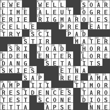 ACROSS 1. She-sheep 4. Water source 8. Fly high 12. Citrus frut 14. Native American of Southwest Alaska 16. Legendary monster 17. One of the Great Lakes 18. Frustrating wastes of time 20. Cell (Danish) 22. Before (prefix) 23. Ingest 24. Attempt to accomplish something 25. _-fi 28. Groovy apt. 30. Use a spoon 31. Mother 35. Indian title of respect (Mr.) 37. Frog relative 40. Israeli folk dance 41. Locale of original sin 42. Keyboard key 44. Old wives' tales, e.g. 45. Mild oath, euphamism for damn 46. Bristle 47. It is 48. Atmospheres 50. Inactive volcano in Sicily 52. Plant excrement 54. To sift 55. Nanny (var.) 58. Electrical Unit 61. One more than two 63. Southeast Indonesia island 65. Homes 70. Pacific island yam 71. Trial 72. Biscuitlike quick bread 73. "Vaya con ____" 74. Singer James 75. Domed church section 76. Compass dir. DOWN 1. Voters do this 2. One who wires 3. Poet Dickinson 4. Armed conflict 5. Connecticut Ivy Leaguer 6. Part of a journey 7. Mass 8. "Barney Miller" actor Jack 9. Stare at amorously 10. Type of rug 11. State of inaction 13. Snakelike fish 15. Canvas cover 19. 480, 500 or 516 sheets of paper 21. Eastern Standard Time (abbr.) 26. Quote 27. Metal shackles 29. A pale violet or amethyst color 30. Scorches 32. A blast of a horn 33. Blunders 34. Actress Charlotte 35. Neighbor of Neb. 36. Painter Guido (1575-1642) 38. Had dinner 39. Prevent from occurring 41. Begley and Asner 43. Assign a rank or rating to 49. Alleged 51. Remaining after all deductions 53. Sliced desserts 55. At full speed 56. Person of subnormal intelligence 57. Came up 58. Johnson of "Laugh-In" 59. Confront 60. Inconspicuous attention getter 62. South American Indian 64. It would 66. Call ___ day 67. Police officer (slang) 68. Followers of ems 69. Perceive with the eye