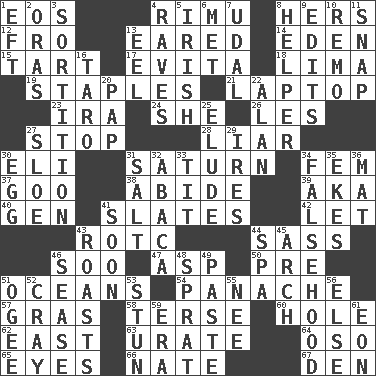 ACROSS 1. Greek goddess of the dawn 4. Tall New Zealand timber tree 8. Possessive pronoun 12. Back 13. Having ears or earlike features 14. Paradise 15. Small pie 17. Webber/Rice musical 18. Pale green bean 19. Paper fasteners 21. Portable computer 23. Retirement account (abbr.) 24. A female animal or person 26. French article 27. Cease 28. One who doesn't tell the truth 30. Biblical high priest 31. Titan orbits this 34. Opposite of masc. 37. Thick or sticky substance 38. Stay 39. Alias (abbr.) 40. Commissioned military rank (abbr.) 41. Chalkboards 42. Allow 43. College mil. group 44. Backtalk 46. "Barney Miller" actor Jack 47. Viper 50. Before (prefix) 51. Seas 54. Flamboyance 57. Pate de foie ____ 58. Laconic 60. Opening into or through something 62. 90 degrees 63. A salt of uric acid 64. Bear (Spanish) 65. Sight organs 66. Nathan's nickname 67. Lair DOWN 1. Lizard (obsolete) 2. Mouths or openings 3. Drawing lots 4. All-night dance parties 5. From or relating to Ireland 6. Was introduced to 7. Hereditary estate 8. Assistant 9. Proofreads 10. San ____ (Riviera town) 11. Fastener 13. Snakelike fish 16. Pacific island yam 20. Infant food 22. Actor Alda or Thicke 25. Dodge 27. _ gin 29. Angers 30. Oval reproductive body of a fowl 31. Table seasoning 32. Phillipine bananalike plant 33. Teat (slang) 34. It jiggles the polygraph 35. Makes supply last 36. Floor covering 41. Within a short period 43. Ridicules or criticizes harshly 44. Health resort 45. Bowlike part 46. Gospel singer Marvin 48. Small fatty European fish 49. Thick mixture 51. Double curve, resembling the letter S 52. Supercomputer manufacturer 53. Surprise greatly 55. Born 56. Otherwise 59. Epoch 61. Period of immesurable duration
