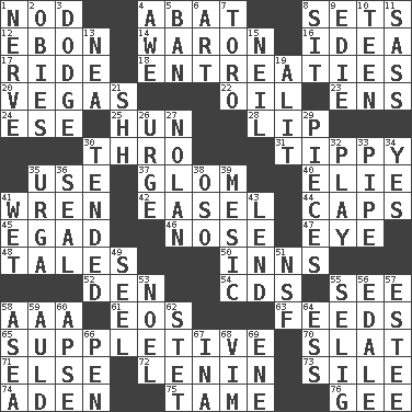 ACROSS 1. Allow head to fall sleepily 4. Blind as ____ 8. Arranges properly for use 12. Inky black, to poets 14. Make _____ (do battle with) 16. The main thing one is thinking about 17. Travel on or in a vehicle 18. Pleas 20. Viva Las _ 22. Lubricate 23. Followers of ems 24. Compass dir. 25. Attila the _ 28. Mouth edge 30. Through, poetically 31. Likely to tip or tilt 35. Purpose 37. Seize upon or latch onto something 40. Writer Wiesel 41. Songbird 42. Artist's stand 44. Balmoral and tarboosh 45. Mild oath 46. Sense of smell 47. Sight organ 48. Falsehoods 50. Restaurants 52. Lair 54. Music discs 55. Perceive with the eye 58. American Automobile Association (abbr.) 61. Greek goddess of the dawn 63. Gives food to 65. Supplying deficiencies 70. Narrow board 71. Otherwise 72. Soviet premier 1918-24 73. Filth; sediment 74. An important port of Yemen 75. Docile 76. Turn to the right DOWN 1. Boldness 2. Off-Broadway awards 3. Evade 4. Deep reverence 5. Forbid 6. Nonscientific branch of learning 7. "Corrida" creature 8. Be seated 9. Singer Brickell 10. Adolescent 11. Backtalk 13. Teachers' org. 15. Famous astronaut Armstrong 19. Set down 21. Quiet! 26. Goad 27. Pitcher Ryan 29. Components 30. Looked after 32. Shaw product 33. Corncob 34. It is so 35. Capital and largest city of Mongolia 36. Lick closed 38. Bear (Spanish) 39. Mesonic 41. Soggy 43. Grant temporary use of 49. Stitch closed the eyes of (a falcon) 51. Science/research agcy. 53. Christmas carol 55. Former Milwaukee Brewers owner Bud 56. Peak District village in England 57. First name in cosmetics 58. Toward the sea 59. Old (Scot.) 60. Domed church section 62. Proofreading order 64. Curvy letter 66. Fenced enclosure 67. _ tizzy (2 wds.) 68. Zeal 69. Compass dir.
