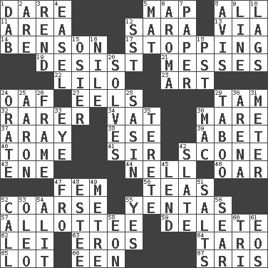 ACROSS 1. Have the gumption 5. Atlas unit 8. 100% 11. Type of rug 12. "Two Mules for Sister ____" 13. By way of 14. Gillaume's butler role 17. Ceasing 19. Stop 21. Makes clutter 22. _ and Stitch 23. Nonscientific branch of learning 24. Clumsy lout 27. Snakelike fish 29. Scottish cap 32. More valued for its uncommonness 34. Large container 36. Female horse 37. Like ___ of sunshine 38. Compass dir. 39. Collude with 40. Heavy book 41. Title for a knight 42. Biscuitlike quick bread 43. Compass dir. 44. 1994 drama film starring Jodie Foster 46. Rowing implement 47. Opposite of masc. 50. Beverages made from leaves 52. Unrefined 55. Gossips 57. One to whom something is allotted 59. Keyboard key 62. Luau accessory 63. Greek god of love 64. Pacific island yam 65. Car dealer's back yard 66. Car or cant ending 67. Indian titles of respect DOWN 1. Pat or tap gently 2. "We ___ not amused" (Victoria) 3. Tear apart 4. Artist's stand 5. Floor covering 6. Scent 7. Some stationery 8. Opinion 9. Actor's bit 10. Falls behind 12. Fast jet (abbr.) 15. Flexible twig of a willow tree 16. "Death on the ____" 18. Pacific Standard Time (abbr.) 20. Finds the solution 24. Declaim 25. Composer Copland 26. Movie unit 28. Indian antelope 29. Off limits 30. Sports stadium 31. Distance measurement 33. Sight organ 35. Cylindrical with tapered ends 36. Apple computer (short form) 42. Schedule 45. Grant temporary use of 47. Back 48. First name in cosmetics 49. Distance measurement (Brit.) 51. Table seasonings 52. Give a ring to 53. Butter sub 54. Set down 55. It is so 56. Shrivel 58. Period of immesurable duration 60. Three (prefix) 61. Greek goddess of the dawn
