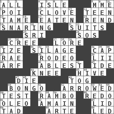 ACROSS 1. 100% 4. Small island 8. Madame (abbr.) 11. Luau course 12. Garlic unit 14. Adolescent 15. Docile 17. Consumed 18. Tear apart 19. Catching in a trap 21. Sets or collections 23. _ Lanka 24. Distress signal 25. Algonquian 27. Old wives' tales, e.g. 30. Ending with capital 31. Fodder prepared in a silo 34. Head covering 37. Actress Charlotte 38. Cowboy competition 39. Cards in a Roman deck? 40. Sandy's bark 41. Most capable 43. Binary compound 44. Leg joint 45. Hub of activity 47. Pass on 49. Coat; cloak 50. Beat drum 52. Moved like an arrow 56. Trial 57. Role for Stallone 60. Make new 61. Butter sub 62. With great haste 63. Hat (slang) 64. Small boy 65. Johnson of "Laugh-In" 66. Directed DOWN 1. Tenement units (abbr.) 2. Grant temporary use of 3. Pale green bean 4. Ancient Celtic tribe of eastern Britain 5. Volcanic refuse 6. Car dealer's back yard 7. First lady 8. Confronts 9. Not women's 10. Conclude 13. Followers of ems 14. Musical group of three 16. Celtic language 20. Angers 22. Purpose 25. Russian ruler of old 26. Coral collection 27. Dipping utensil 28. Double curve, resembling the letter S 29. Vintage cars 30. Retirement account (abbr.) 32. SW Asia republic 33. Ear part 34. 154 in Roman numerals 35. Assistant 36. Sliced dessert 42. Son of Odin 44. Cask 46. Composer Stravinsky 47. Administered medicine 48. To the inside or interior of 49. Heavy duty weighing machine 50. Actor Lugosi 51. Mouth or opening 52. "This won't hurt ____!" 53. Water source 54. Singer Brickell 55. Texas town _ City 56. Small child 58. Nursemaid (var.) 59. Impair