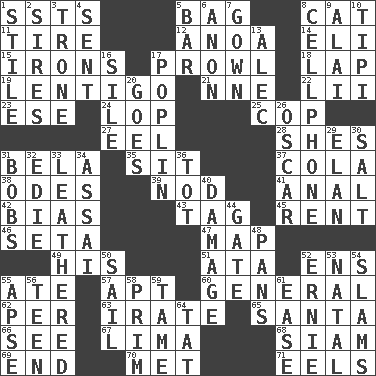ACROSS 1. Fast planes 5. Container for groceries 8. Feline 11. Become fatigued 12. Small Philippine buffalo 14. Connecticut Ivy Leaguer 15. Metal shackles 17. Move like a hungry wolf 18. Infant locale 19. Small, flat, pigmented spot on the skin 21. Compass dir. 22. Cards in a Roman deck? 23. Compass dir. 24. Chop off 25. Police officer (slang) 27. Snakelike fish 28. "______ My Girl" (Turtles hit) 31. Actor Lugosi 35. Be seated 37. Root beer relative 38. Lyric poems 39. Lower and raise head in agreement 41. Of or related to the anus 42. Prejudice 43. Label 45. Monthly bill 46. Bristle 47. Atlas unit 49. Part of HMS, perhaps 51. "One Day ___ Time" 52. Followers of ems 55. Had dinner 57. Fitting 60. Commissioned military rank 62. For each 63. Feeling or showing extreme anger 65. Before Barbara or Clara 66. Perceive with the eye 67. Pale green bean 68. Thailand, formerly 69. Conclusion 70. Was introduced to 71. Snakelike fish DOWN 1. Vertical member of a panel or frame 2. Begets 3. Marketplace scale 4. Transmitted 5. Tavern 6. At once, immediately (arch.) 7. Bride's dress 8. Portable communications device 9. Jai ____ 10. Native american tent (variation) 13. Actor Baldwin 16. Drop; flow; fall 17. Cotton for raincoats, e.g. 20. Moves 26. Motion picture award 29. Liveliness 30. Table seasoning 31. Moves up and down 32. Singer Brickell 33. Resembling or made to resemble leather 34. Slender Brazilian palm 36. Small child 40. Break 44. Yard entry 48. Baking dishes 50. Move on water 52. Bert's buddy 53. Brizilian seaport 54. Hits or strikes with great force 55. Domed church section 56. Adolescent 58. Demure 59. Not wild 61. Relaxation 64. Make lace