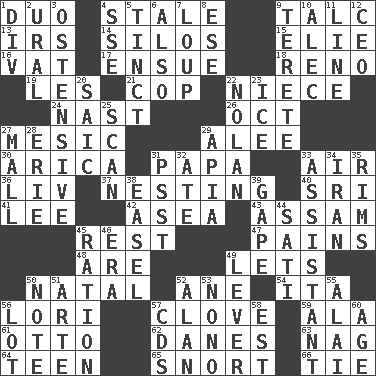 ACROSS 1. Superhero pair 4. Showing deterioration from age 9. Baby powder 13. Big collection agency 14. Grain storage towers 15. Writer Wiesel 16. Large container 17. Take place subsequently 18. Former U.S. Attorney General Janet 19. French article 21. Police officer (slang) 22. Sibling's daughter 24. Political cartoonist Thomas 26. Sep. follower 27. Of or pertaining to a meson 29. Toward shelter 30. N. Chile seaport 31. Dad 33. Atmosphere 36. 54 in ancient Rome 37. Snuggling 40. _ Lanka 41. Area sheltered from the wind 42. At sea 43. Indian state 45. State of inaction 47. Aches 48. "We ___ not amused" (Victoria) 49. Allows 50. Relating to or accompanying birth 52. One (Scot) 54. Call ___ day 56. Australian parrot (variant) 57. Garlic unit 59. In the manner of 61. Von Bismarck 62. Natives or inhabitants of Denmark 63. Tired old horse 64. Adolescent 65. Derisive sound 66. Make a knot DOWN 1. HTML Container Element 2. Mountain range 3. Clearly or manifestly demonstrative 4. Compass dir. 5. Colored lightly or faintly 6. In addition 7. Central Nebraska county 8. Compass dir. 9. Cigar-shaped 10. Actor Baldwin 11. Actor's bit 12. Corporate head (abbr.) 20. Ketch in the Levant 22. Pitcher Ryan 23. Frozen water 25. Examine hastily 27. Shopping center 28. One of the Great Lakes 29. Capital of Western Samoa 31. Inconspicuous attention getter 32. Had dinner 33. Helper 34. SW Asia republic 35. Basketball hoops 38. Artist's stand 39. Open wide 44. Suttee (variant) 45. Food allowance for one day 46. Period 49. Prying instrument 50. Observe 51. Johnson of "Laugh-In" 52. Actor Alda or Thicke 53. Words to Nanette 55. Jai ____ 56. Car dealer's back yard 57. Music discs 58. Eastern Standard Time (abbr.) 60. Mature