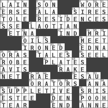 ACROSS 1. (Had) reclined 5. Male offspring 8. Had on 12. Celtic language 13. According to 14. Male parents of animals 15. Lacquered or enameled metalware 16. Dwellings 19. Compass dir. 20. Of or relating to Laos or its people 21. Inactive volcano in Sicily 23. Indiana (abbr.) 24. Medical imaging device (abbr.) 27. Petroleums 30. Rendezvous 31. Pressed 34. Pulitzer Prize-winning author Ferber 35. Mouths or openings 38. Stories 40. Sew up the eyelids of hawks and falcons 41. Loose flowing garment 42. Food holders 44. Deliberation 45. Libertine 46. Remaining after all deductions 47. Actress Charlotte 50. He sold his birthright 53. Speakers 57. Santa ___, CA 59. Supplementary 63. Indian titles of respect 64. First name in cosmetics 65. Lair 66. "Silly old bear" 67. Separate forcefully 68. Conclusion 69. Singer Murray DOWN 1. Allows 2. Came up 3. Small island 4. Born 5. "Two Mules for Sister ____" 6. Margarine 7. Political cartoonist Thomas 8. Victory 9. The grampus (Milton) 10. Portuguese money of account (variant) 11. Double-curved letter 14. Transmit 17. One more than two 18. Daniel's nick name 20. Den 22. Annoying sounds 24. Ancient Persian 25. French philosopher Descartes 26. Slanted text style (abbr.) 28. Car dealer's back yard 29. Fastener 30. Makes clutter 32. Pipe bend 33. Letter starter 35. NW Algerian seaport 36. Be footloose 37. "This won't hurt ____!" 39. R.R. building 43. Makes supply last 47. Hero or heavy, e.g. 48. "We ___ not amused" (Victoria) 49. Erode 51. Composer Copland 52. The state of being joined or united 54. Event that recurs at intervals 55. Baking chamber 56. Tear apart 58. American tennis player Robert 59. Put into a specified state 60. Purpose 61. Parent Teacher Association (abbr.) 62. For each 63. Health resort