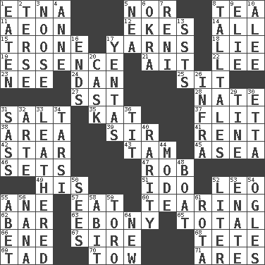 ACROSS 1. Inactive volcano in Sicily 5. Not either 8. Beverage made from leaves 11. A really long time 12. Makes supply last 14. 100% 15. Marketplace scale 17. Entertaining tales 18. Falsehood 19. Core 21. Small island 22. Area sheltered from the wind 23. Born 24. One of the 12 tribes of Israel 25. Be seated 27. Fast jet (abbr.) 28. Nathan's nickname 31. Table seasoning 35. Krazy ___ of comics 37. Secret move to avoid paying debts 38. Type of rug 39. Title for a knight 41. Monthly bill 42. Play the lead 43. Scottish cap 45. Toward the sea 46. Puts into a specified state 47. Director Reiner 49. Part of HMS, perhaps 51. Wedding promise 52. Lion 55. One (Scot) 57. Erode 60. Pulling apart 62. Long, evenly shaped piece 63. Dark wood 65. Add up to 66. Compass dir. 67. Father 68. Wig 69. Small boy 70. Pull behind 71. Ancient Greek god of war DOWN 1. Ingested 2. Laconic 3. Trap for birds or small mammals 4. Singer Murray 5. Teachers' org. 6. Gumbo ingredient 7. Painter Guido (1575-1642) 8. Baron Munchausen's specialties 9. Writer Wiesel 10. Toward shelter 13. Fast planes 16. Conclusions 17. Gossips 20. Keg 26. Kind of red light 29. Prong on a fork 30. Singer James 31. Backtalk 32. Johnson of "Laugh-In" 33. Resembling or made to resemble leather 34. Tarsus (plural) 36. Teat (slang) 40. Noteworthy scarcity 44. Method 48. Water vessel 50. Perceives with the eye 52. 61 cubic inches 53. Maternal 54. Stares 55. Collude with 56. Nanny 58. "This won't hurt ____!" 59. "Corrida" creature 61. Round or rotation of duties 64. ___ Haven, CT