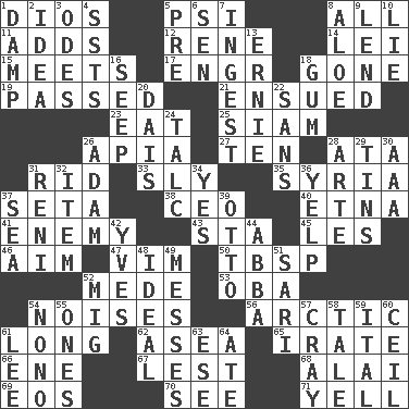 ACROSS 1. "Vaya con ____" 5. Air pressure measure (abbr.) 8. Everything 11. Does sums 12. French philosopher Descartes 14. Flowery wreath 15. Confronts 17. Engineer (abbr.) 18. Went 19. Went by 21. Followed as a consequence or result 23. Ingest 25. Thailand, formerly 26. Capital of Western Samoa 27. "___ Little Indians" 28. "One Day ___ Time" 31. To free from 33. Roguish 35. Damascus' land 37. Bristle 38. Corporate head (abbr.) 40. Inactive volcano in Sicily 41. Foe 43. R.R. building 45. French article 46. Direct toward a target or goal 47. Zeal 50. Cook's measure (abbr.) 52. Ancient Persian 53. Chief or king in Benin or Nigeria 54. Annoying sounds 56. Northern region 61. Yearn 62. Toward the sea 65. Feeling or showing extreme anger 66. Compass dir. 67. For fear that 68. Mountain range southwest of Kyrgyzstan 69. Greek goddess of the dawn 70. Observe 71. Shout DOWN 1. Moist 2. It may be bright or harebrained 3. Lyric poems 4. Fast planes 5. Before (prefix) 6. Elected rep. 7. Swallow 8. _ vera 9. Grant temporary use of 10. Untruth 13. Bert's buddy 16. Ooze 18. Chewing product 20. Raised platform 22. Without 24. Baby powder 26. First man 28. Johnson of "Laugh-In" 29. Airtight sealed metal containers 30. American Automobile Association (abbr.) 31. Painter Guido (1575-1642) 32. Detail 34. Consenting reply 36. Sharp bark 37. Ocean 39. Von Bismarck 42. Jacques Cousteau's middle name 44. Swedish rock group 48. Perfect 49. Makes clutter 51. Indian skirt 52. Russian fighter aircraft 54. Words to Nanette 55. Washington bills 57. Supercomputer manufacturer 58. Falsehood 59. Slanted text style (abbr.) 60. To provide with a ceiling 61. Area sheltered from the wind 63. Compass dir. 64. Had dinner